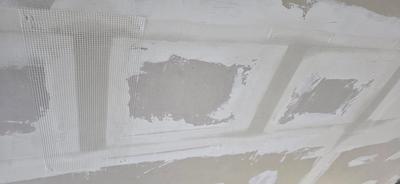 I put glass fiber meshes over the metal brackets on the ceiling. Then I mixed a bucket with coarse mud.