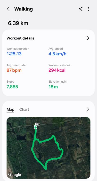 The new watch can capture loads of information. I can die in a sea of statistics. The walk was 6.39 kilometres. We met a cow on the path. That was not a delightful experience. He stopped, and we wondered what we should do. I decided to walk into the bushes, but I did not communicate this well with DW. This is a typical communication error on my part. I think I said "We go here," but she didn't hear it, and it wasn't nice of me. Anyway, she understood my intention and followed me into the bushes. In the telelens of my camera, through the shrubs, I could see that the cow accepted our disappearance trick.