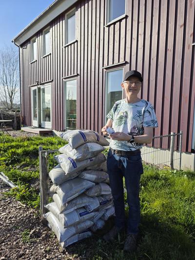 I took out the tiller machine. It started nicely, and I tilled the beds from A5 to D5. Here, we have not laid any paths with woodchips, so it was just a matter of tilling the whole area. Then I tilled C1 through C4, and likewise with A1 through A4. In all these areas, I spread the 500 kg of sand that I bought last Wednesday. It was all fluffy when I was done. I am not ready just yet. I will put sheep manure and hay rests in these beds as well. Especially the potatoes like that treatment. But that is for tomorrow.