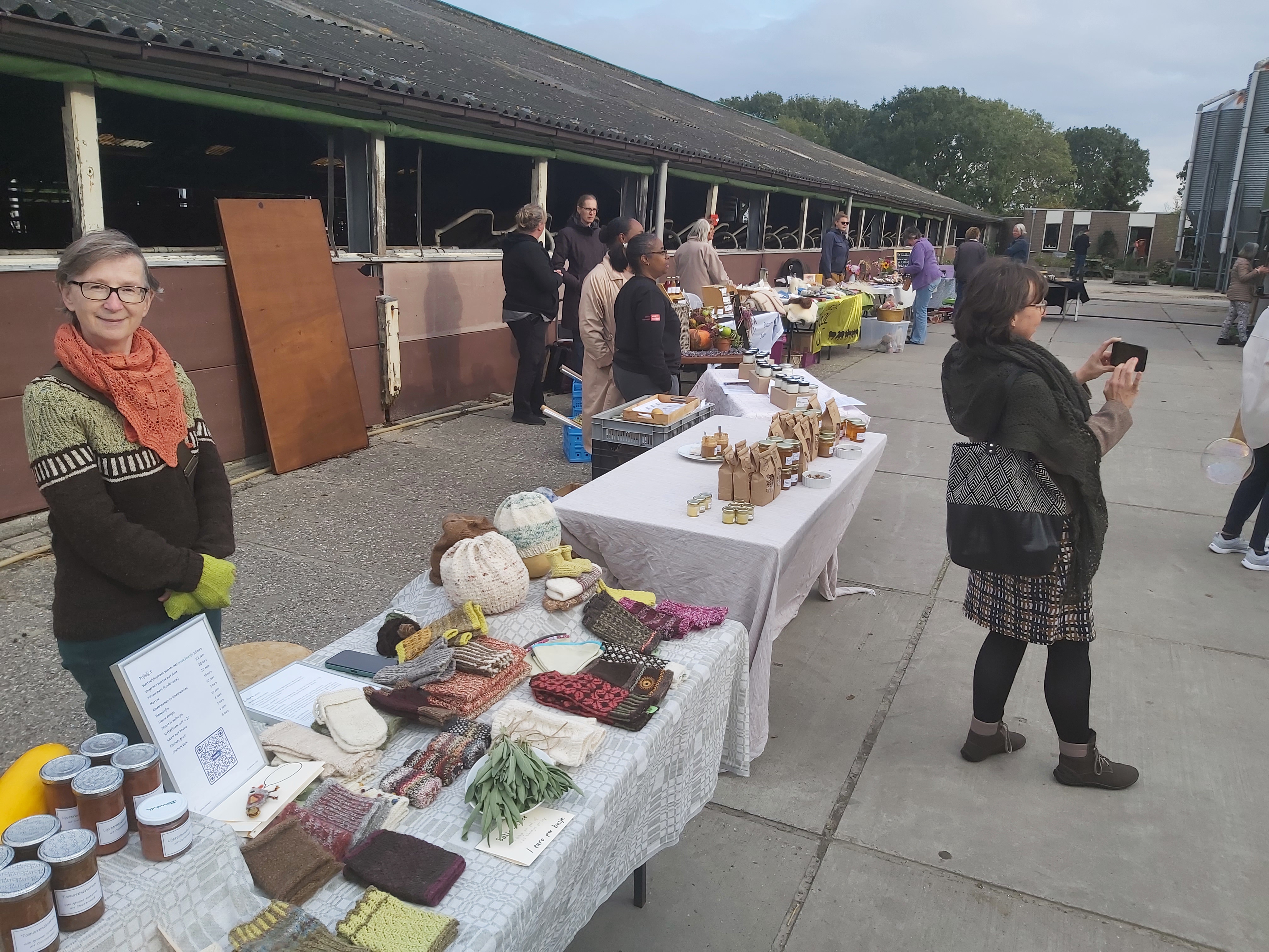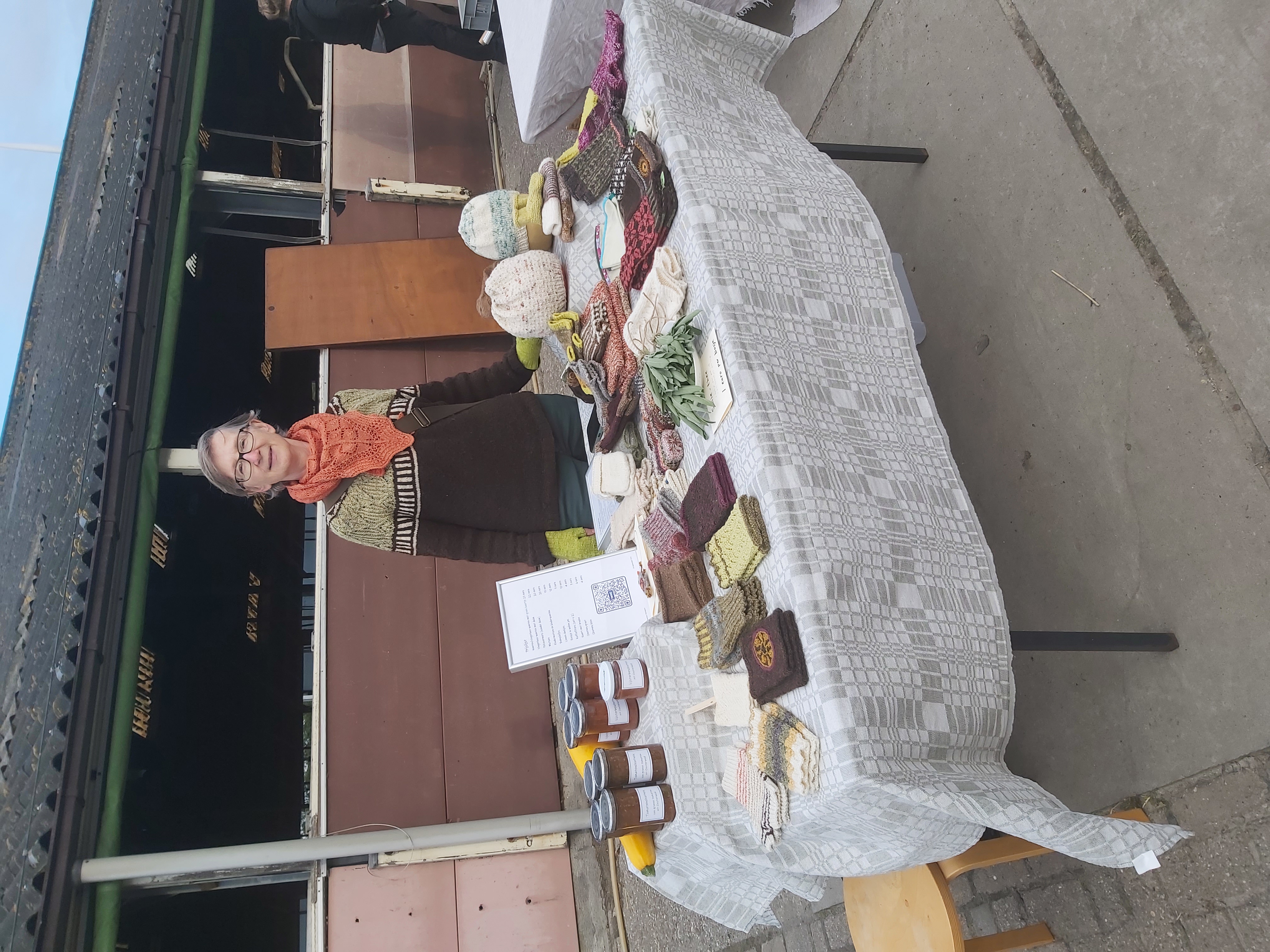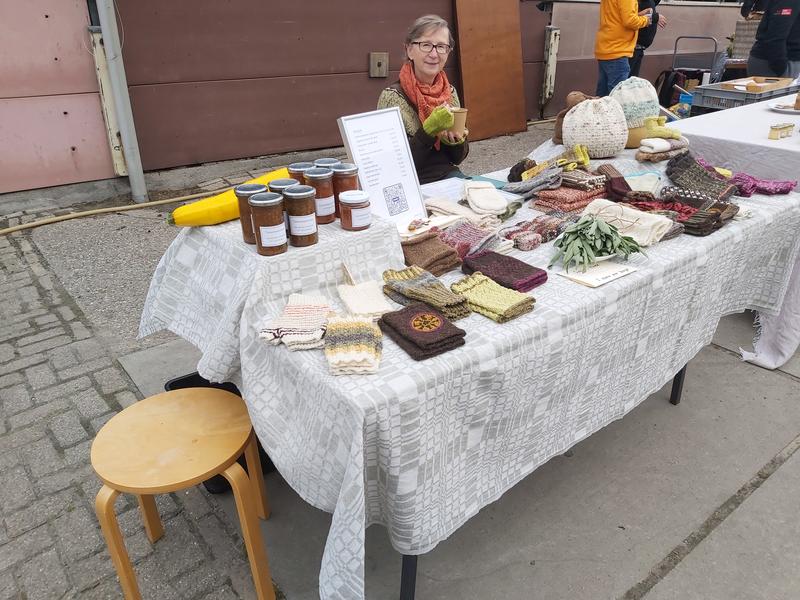 DW sold gloves, mittens, and hats that she had made herself. She also sold homemade chutney from tomatoes and from rowan berries. Two different sorts. She also offered coffee filters and homemade soap bars in a wool jacket. There was a lot to see at her desk. The sales went very well.