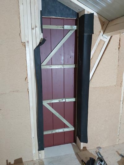 First, I cut open the vapor barrier where I wanted to have the hatch. The vapor barrier is a special type of fabric or tarpaulin installed inside the wall, ensuring that no moisture enters the house. The builder has asked if I would like to leave a review, and I am hesitant because there is one thing about the building that I really do not like: the nails for the facade are too long. The idea was that I should insulate the building from the inside, and when doing that, the nails are poking through the vapor barrier. That is not how it should be if you are asking me. If I file an honest review, I will have to admit that I bought a barn with a vapor barrier that has been pierced in thousands of places. Alternatively, I could choose not to file a review. Perhaps a better alternative.