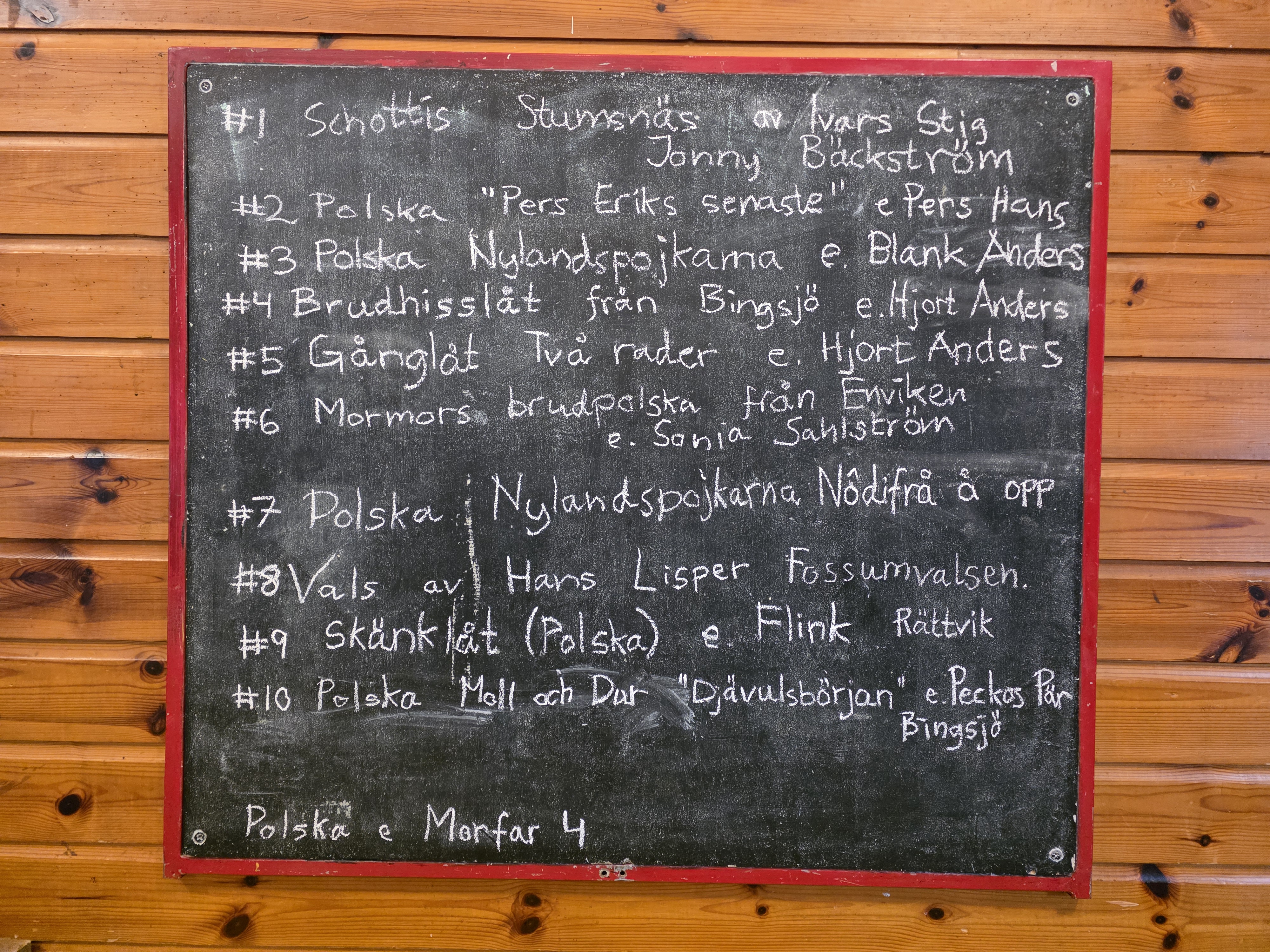 After the dinner, the course started. Täpp Ida taught us three tunes. While we were practicing the tunes, I discovered that my violin had a crack between the neck and the fingerboard. That was not a nice experience. I spoke to the event organizer, and there is a spare violin I can use if the one I have breaks completely. I got my violin from my grandfather, Erik Malmgren. I like the violin a lot. It is not an especially expensive violin, but it has served me well.