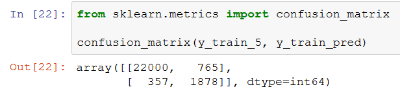 We will evaluate the performance of the classifier with the help of the confusion matrix. The image stored in the variable “Some image” is what we are looking for – it is a 5, and all other cases are non-5. We get counts of four possibilities such as True Negative (Good), False Positive (Bad), False Negative (Bad) and True Positive (Good). With many good compared to fewer bad answers, that might be what we are looking for.