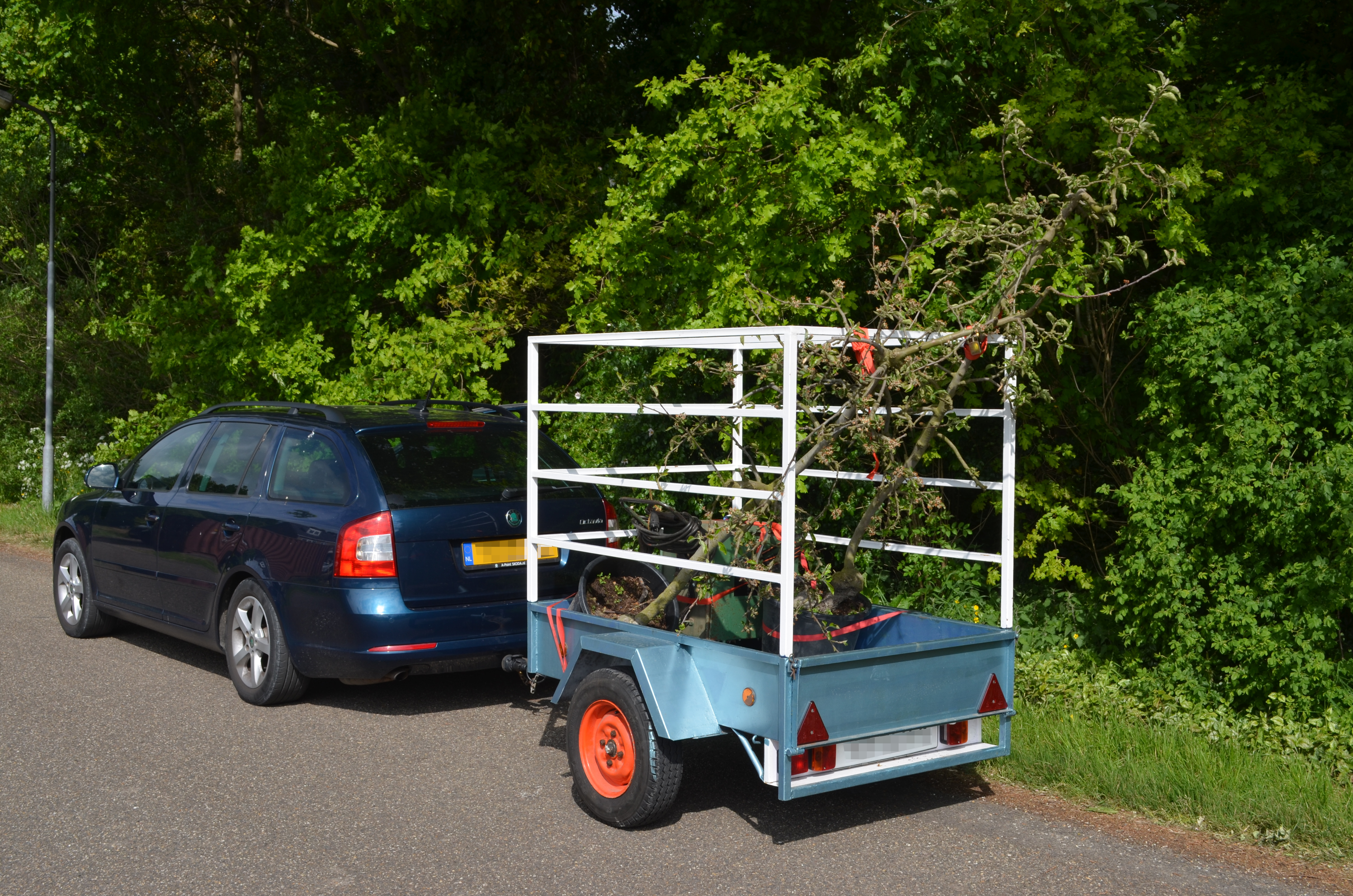 The main event of today was to pick up an apple tree. For this, we would use the trailer that we got last weekend. Before we started on this, I went to the plot to do maintenance on the barrier tape around the property. Some of the bamboo sticks got to endure much wind and broke. I replaced these. It looks like when there is too big a distance between them, they are breaking much quicker.