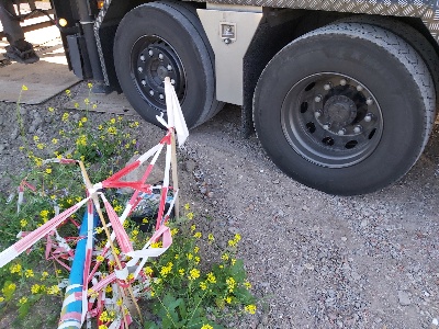First things first, to plant the tree, I begin by digging out a hole. It is like carving in softwood or almost settled concrete where the soil is compacted by the road builders. When doing this, I try to make the dugout into small pieces because I will need soil to put back around the tree. With large chunks, it does not look like soil but more like stones, and that is not handy for the tree. When the hole is deep enough, I add water to the dugout. It turns into clay. I use that to seal the openings. Now I have a place for the tree where water will stay around the root ball a little longer than 2 seconds. Now I can put the tree in the hole and put the rest of the dugout back around the tree. Then I put a stick next to the tree with a barrier tape flag so that we don’t run over the plant by accident.