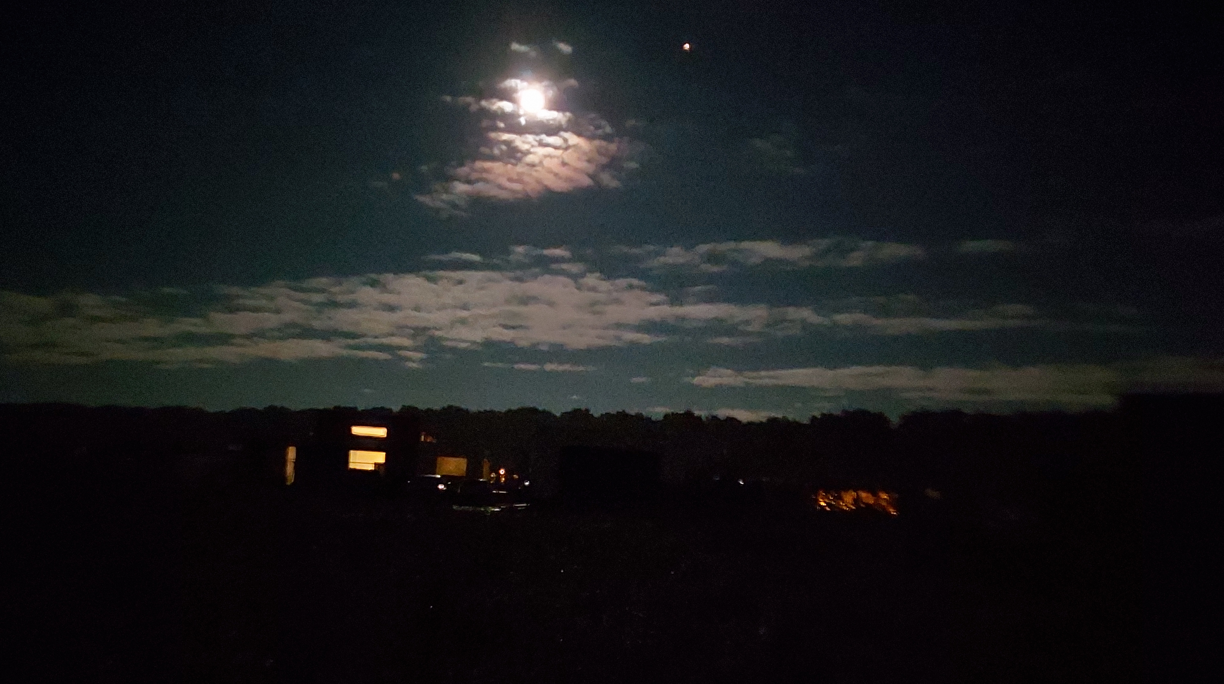 Later in the evening, it became cloudy and behind the clouds was an almost full moon. The net effect was that it became much lighter bluish light in and around the house. We went to bed and slept majestically.