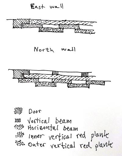 It was like starting the entire discussion all over again. However, when we understood each other, and the confusions were sorted, we concluded it was similar to what we did on the east wall but one layer outwards. Above the door, it is the same thing. On the east wall, we have one horizontal plank resting on horizontal beams attached to the wall. A horizontal plank is resting on a horizontal beam on the north side, but that beam rests on vertical beams on the north side. Because the inner layer of red planks can rest on the door frame’s outer part, we let these planks use half the door frame.