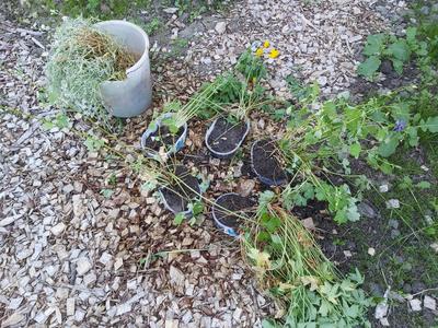 Today we went to neighbors to have a look at their floor tiles. We need to figure out how we will do with floortiles as well. They had lovely tiles, but they also had a garbage container. There were lots of exciting things. I asked if I could do a dumpster dive, and that was all fine. I took out a couple of nice plates from their garbage. I used one as a roof of the sheep house. I can use another as a temporary desk for when I am working in the new house.