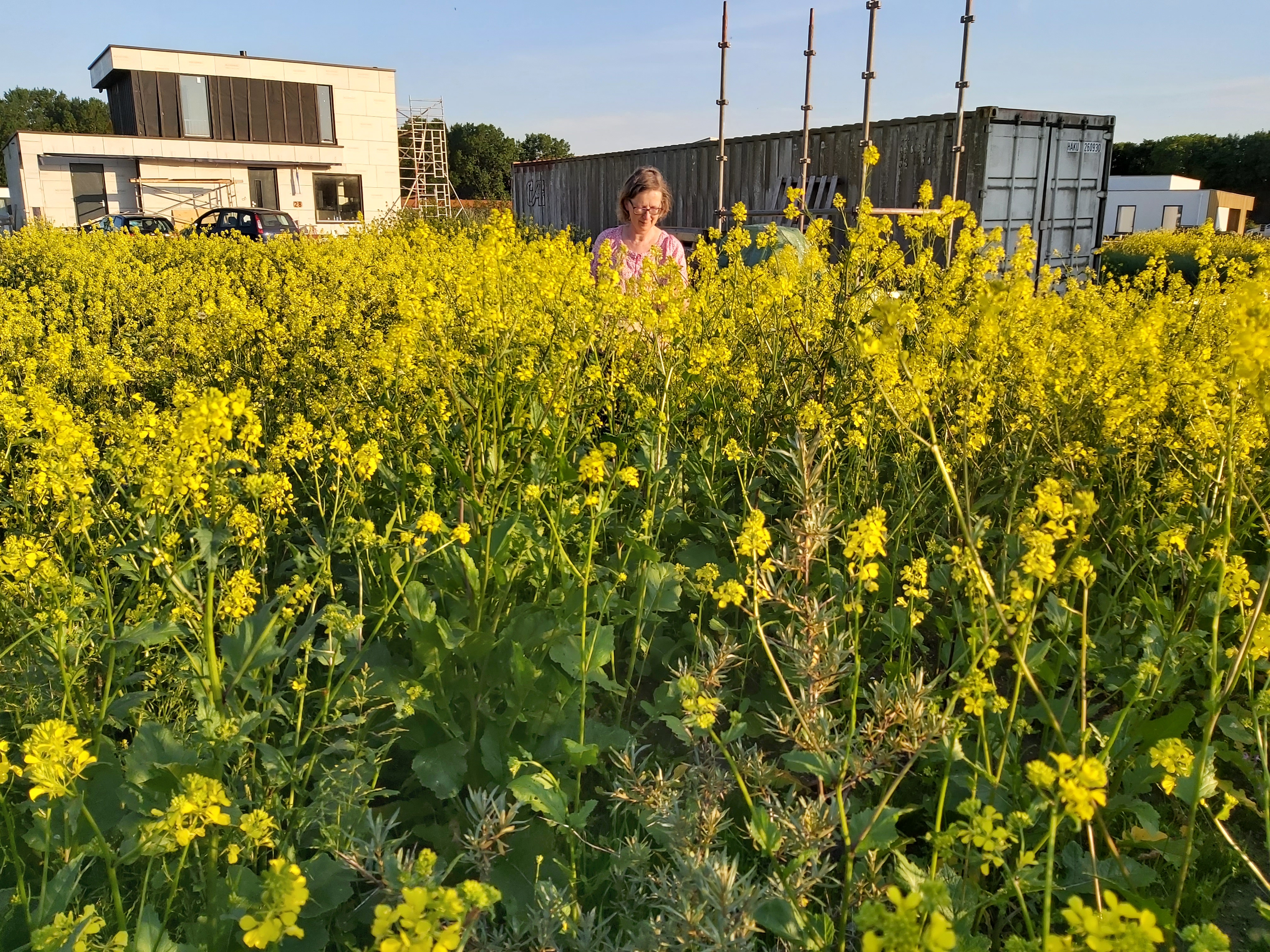 These rapeseed plants are growing at least one decimeter every day. In a couple of days, you cannot see my wife behind the plants. Here she is collecting some flower stems from the rapeseed for having in a salad.