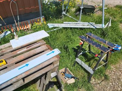 I need many tools to work on the window sills. I already had the measurements for the sills, so I had no reason to climb around testing the sills. I finished two window sills today. It took a long time to set things up, and working with this sun in my back was not optimal.