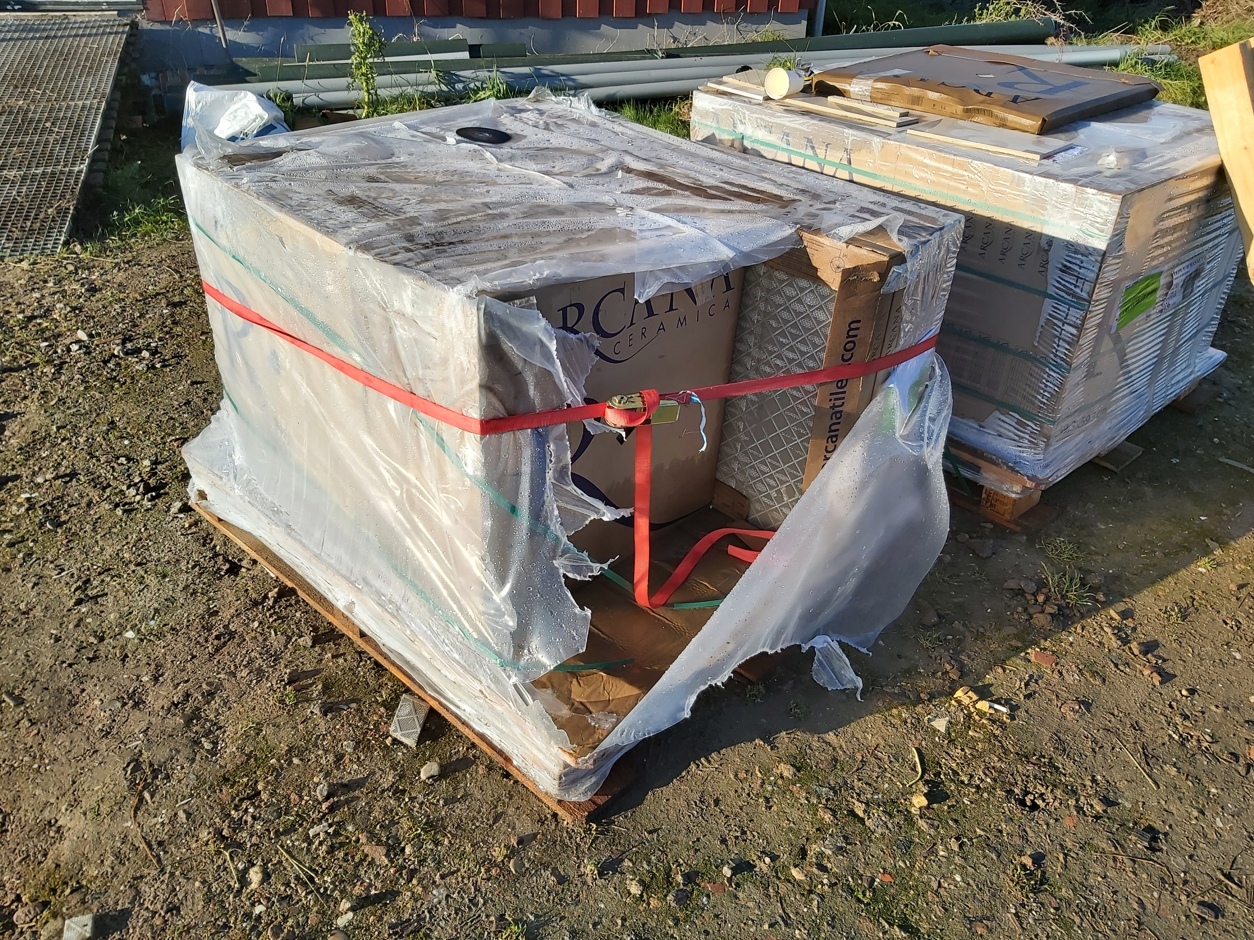 Erik agreed on moving the pallets, but only if they would hold together. I strapped the tiles of the open pallet together. |
