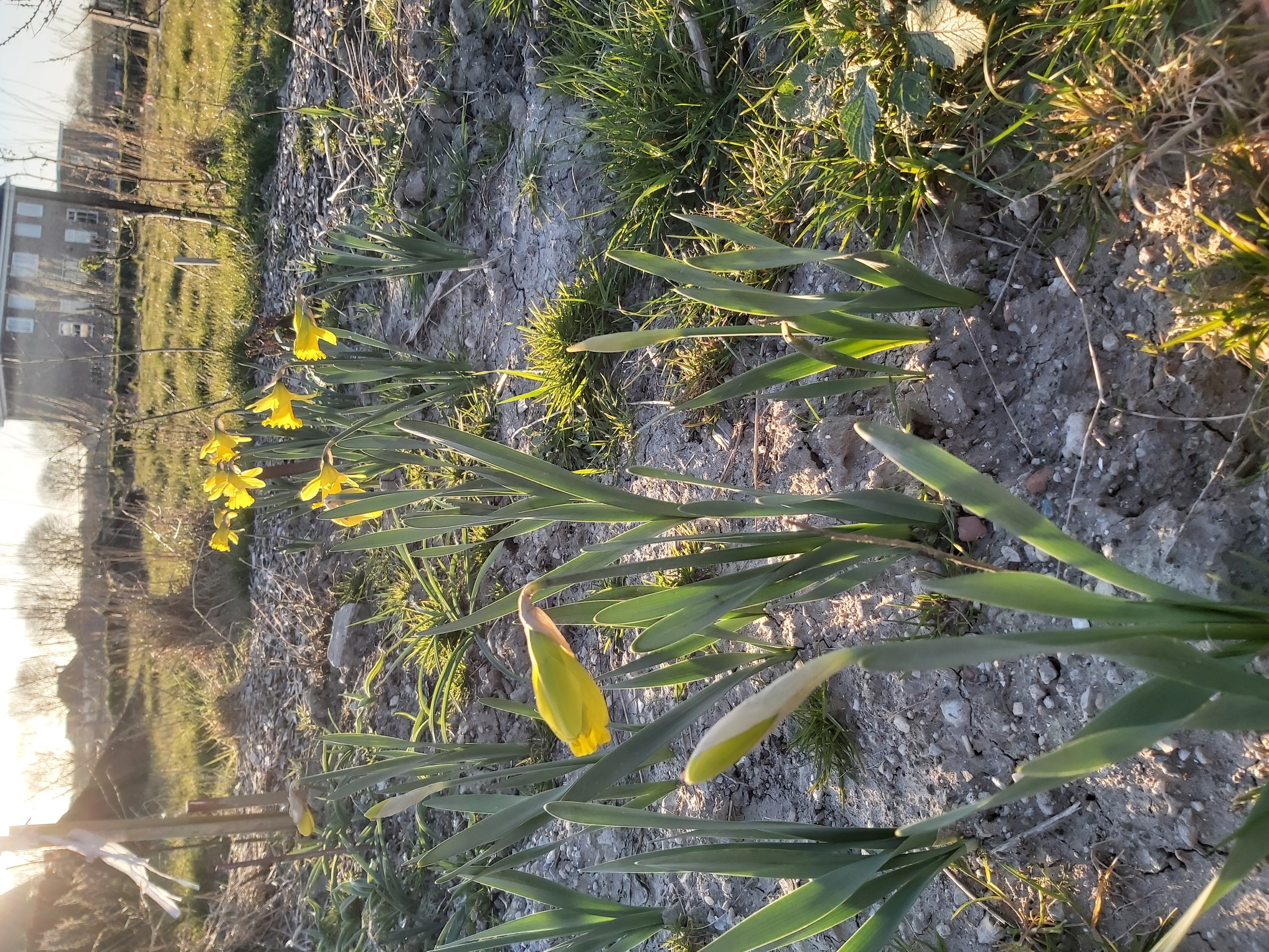 More daffodils are flowering in the flower garden. The Tragopogon porrifolius that I sowed on 9 May last year has bulbs coming. In Dutch, "Morgen ster." Very few of the other seeds germinated last year. DW says there are two versions, and she believes I got Tragopogon Orientalis. It has yellow flowers. All she knows about plants she was taught by her mother, and her mother got only Tragopogon Orientalis. Since the seeds came from my mother-in-law, it is probably true. That means I need to find the Tragopogon porrifolius and try them.