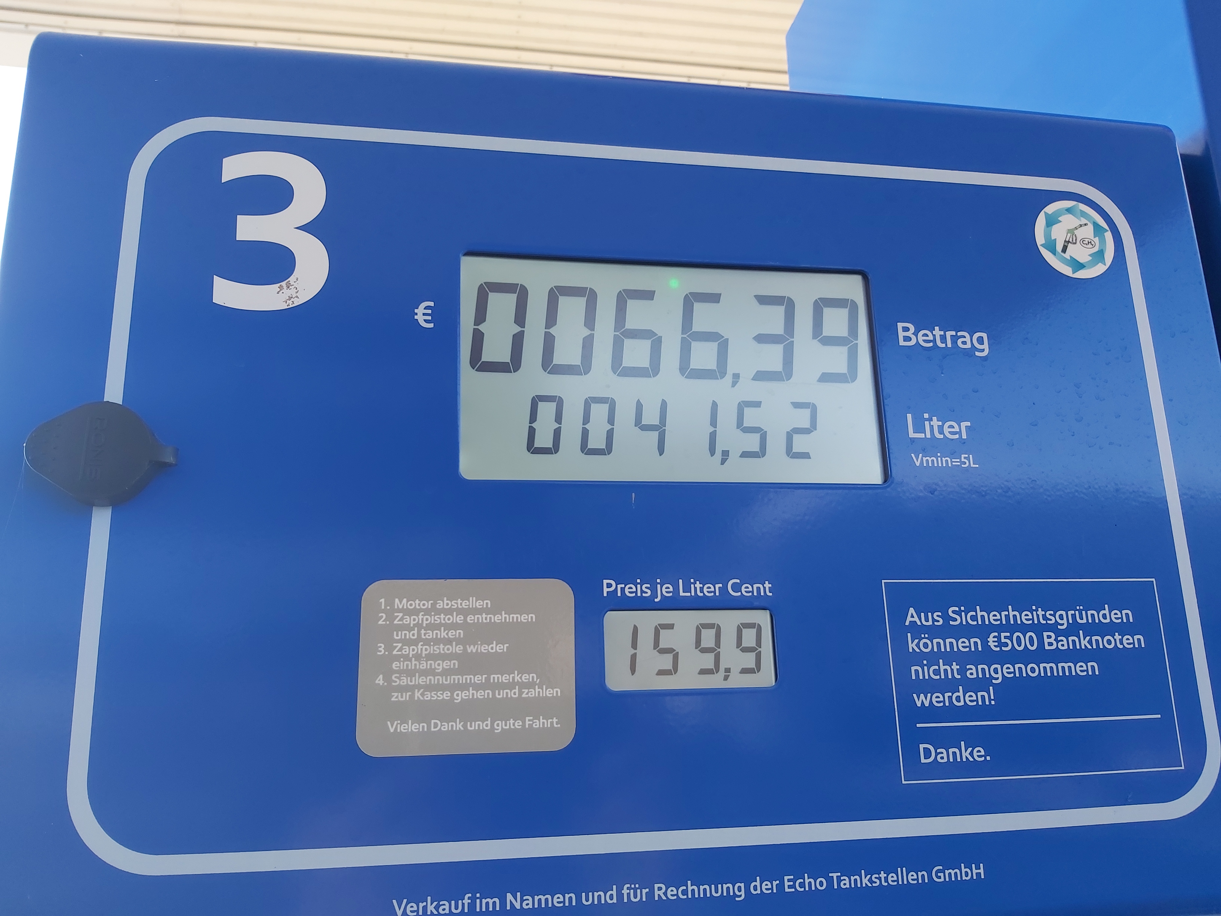 We did not take regular roads through Germany this time. Instead, we had a stop at an Esso at Haselunne in Germany. It had so cheap petrol I had to take a photo of the pump when I had finished filling up the tank. That is almost half the regular price in the Netherlands. I have no idea how that is possible.