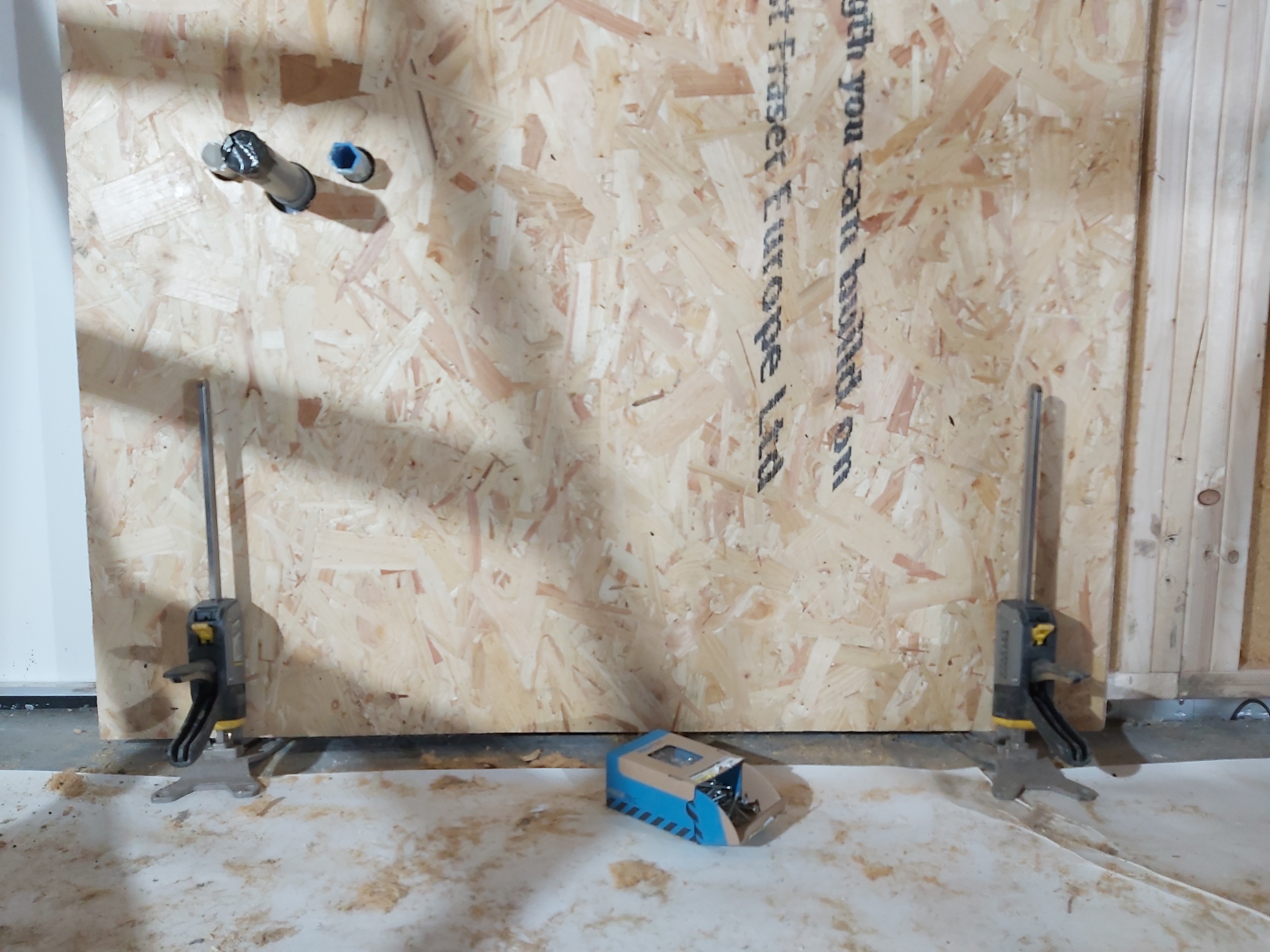 We had a drill that could make large holes, that was great. These holes are for the washbasin's warm and cold water and sewer. The barn will indeed have both cold and hot water. It will be lovely to be able to wash your hands in warm water if that is needed. The idea of hot water came from DW's wool projects. She is washing the wool from the sheep and needs hot water. Since we have it, we can also install it in the restroom.