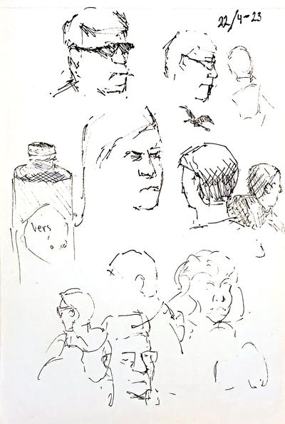 We ate a little of the pancakes that we had brought with us. It is a little dull on the ferry, but DW had knitting, and I did some urban sketching. The last time I did this was long ago, so my portrait skills were rusty. I had one model that looked a little like Arnold Schwarzenegger with fancy shades.