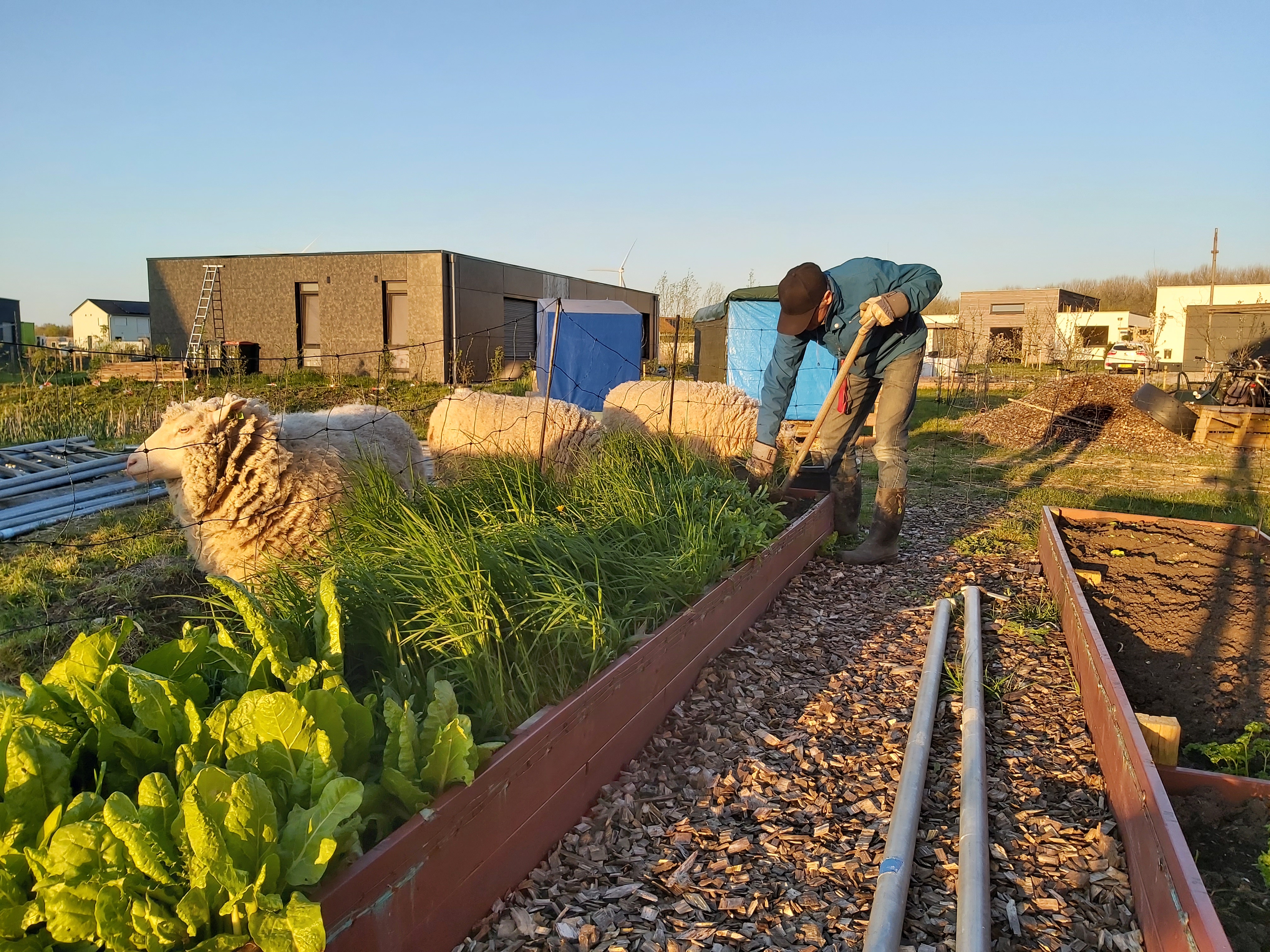 The soil was not that bad and pleasant to work, but it was still chilly wind. I let the sheep get every pluck of grass I removed, and they tried to use the calories. That was difficult because the grass was loose, so now they could not rip it off as they were used to. Since their "dad" was busy, it had to be good stuff, so they did not give up. For every new pluck of grass, at least one sheep wanted to try it.