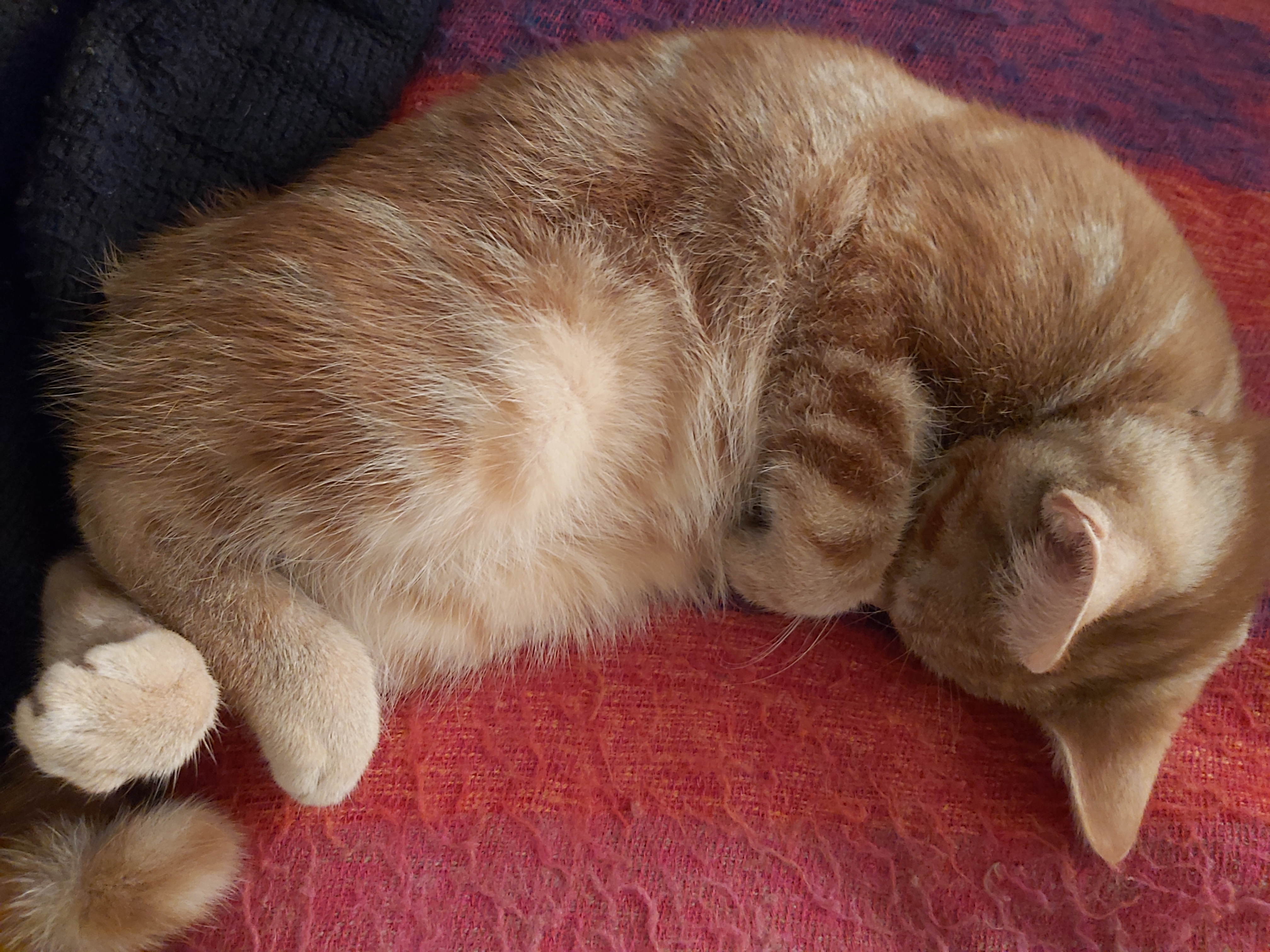 Merida can sometimes stretch from a nap by holding her head with her two front paws; it is the sweetest look ever. It usually takes three milliseconds before it is over, so I have never been able to capture it in a photo.