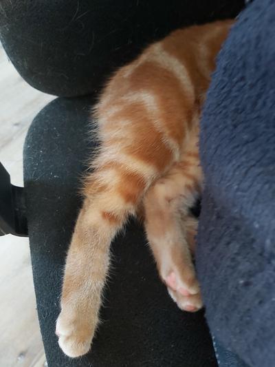 Merida came to lie behind me on my chair. The little brown thing is her toy mouse. All three of us fit on my chair. |