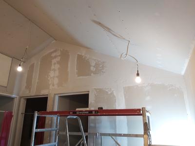Next up, I prepared to plaster the north wall. I applied a scrim band on the joints and inner corners. I used an extra wide scrim band along the top of the wall since we think the joint between the wall and the ceiling might need that.