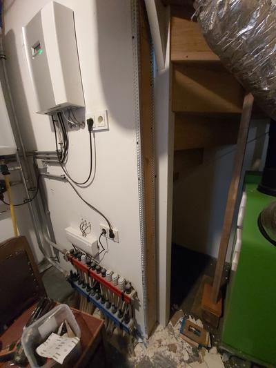 I plastered the triangle, and it looked brilliant. I have to go over this surface with a layer of TopFinish before it is ready to be painted, but that is not much work. Also, the wall in the facility room below the stairs got mud.
