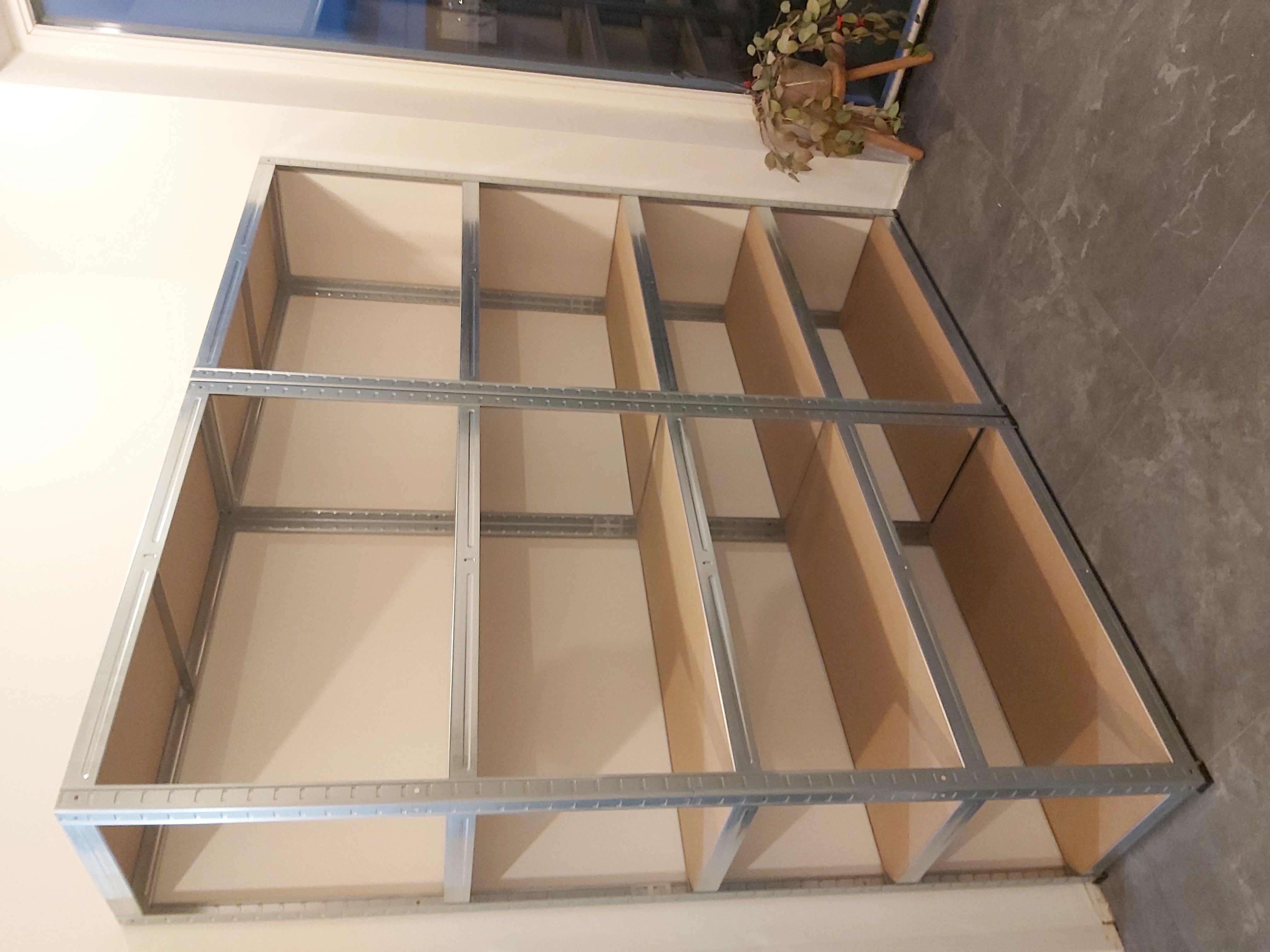 We bought metal shelves. They are made of thin material, which is not much, but it is perfect for this situation. I placed distance padding on the back of the shelves because I didn't want the metal to rub against the wall. I have a third shelf to set up, but we don't have a good place for that. It will be set up, but the place will be a compromise, and I need to figure out where it will be.