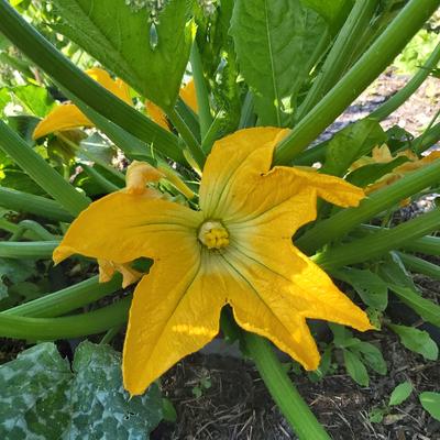 The weather was beautiful this morning, and we harvested the first courgette!