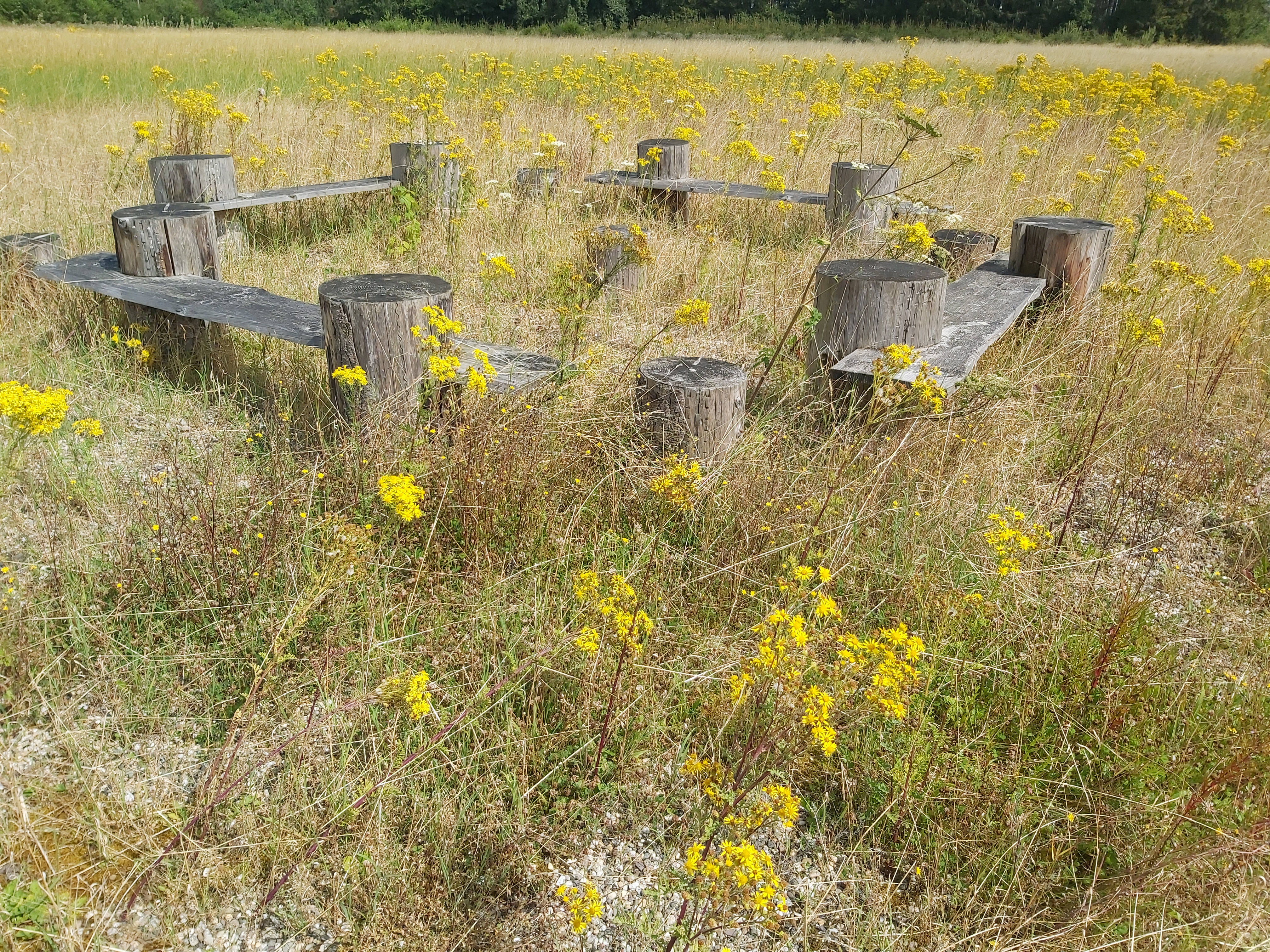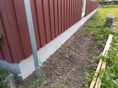 I had time to fill up the gravel below the plates this afternoon. The gravel originates from a neighbor who changed their driveway; they got this leftover. It has been lying so long that grass is now on the heap. The heap is lying near the beginning of our driveway. I hope to use this gravel to fill up below the plates, and if I need more, I will figure out how to deal with that later. This afternoon, I moved two wheelbarrows of gravel.