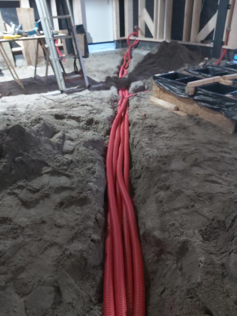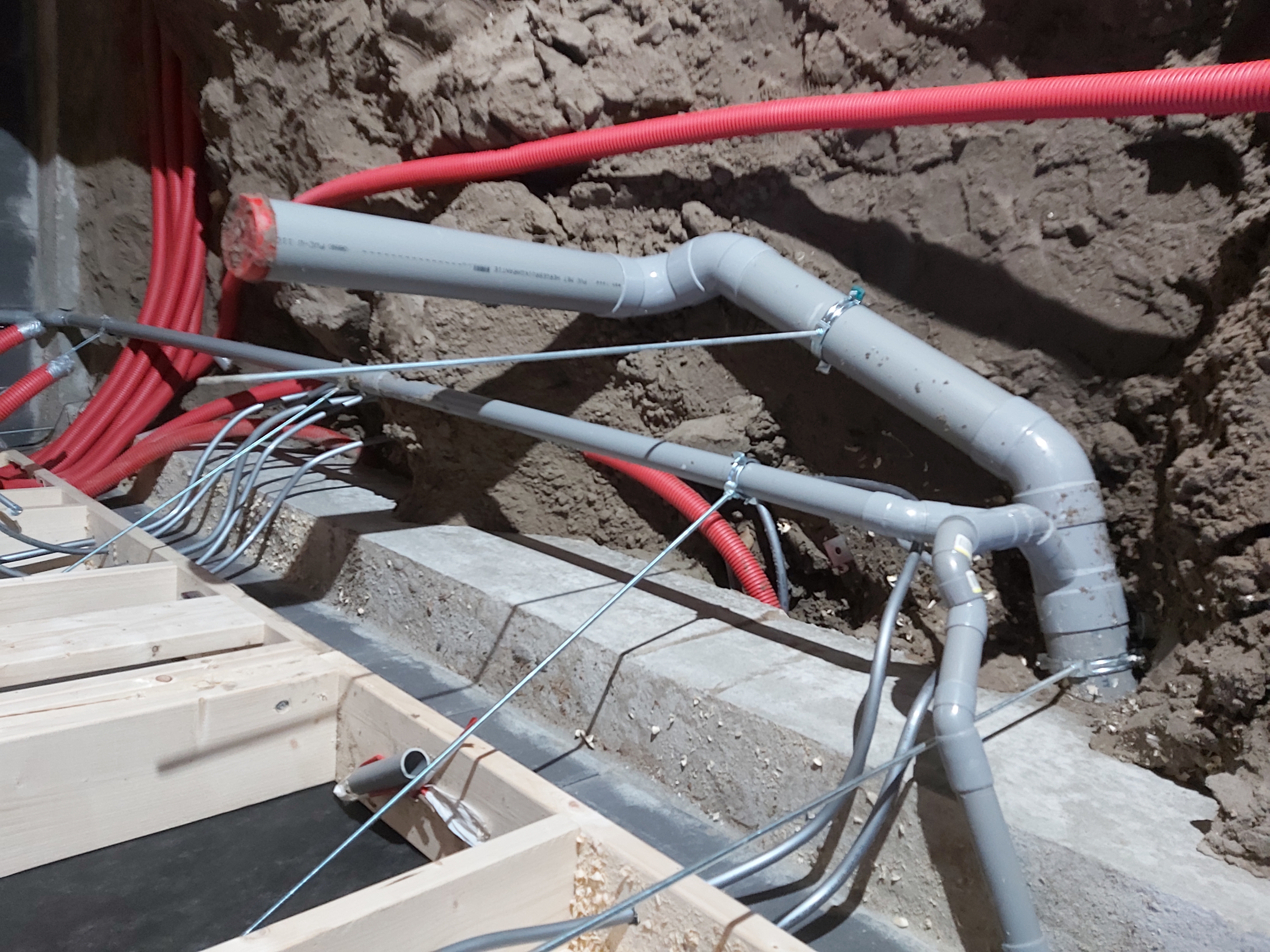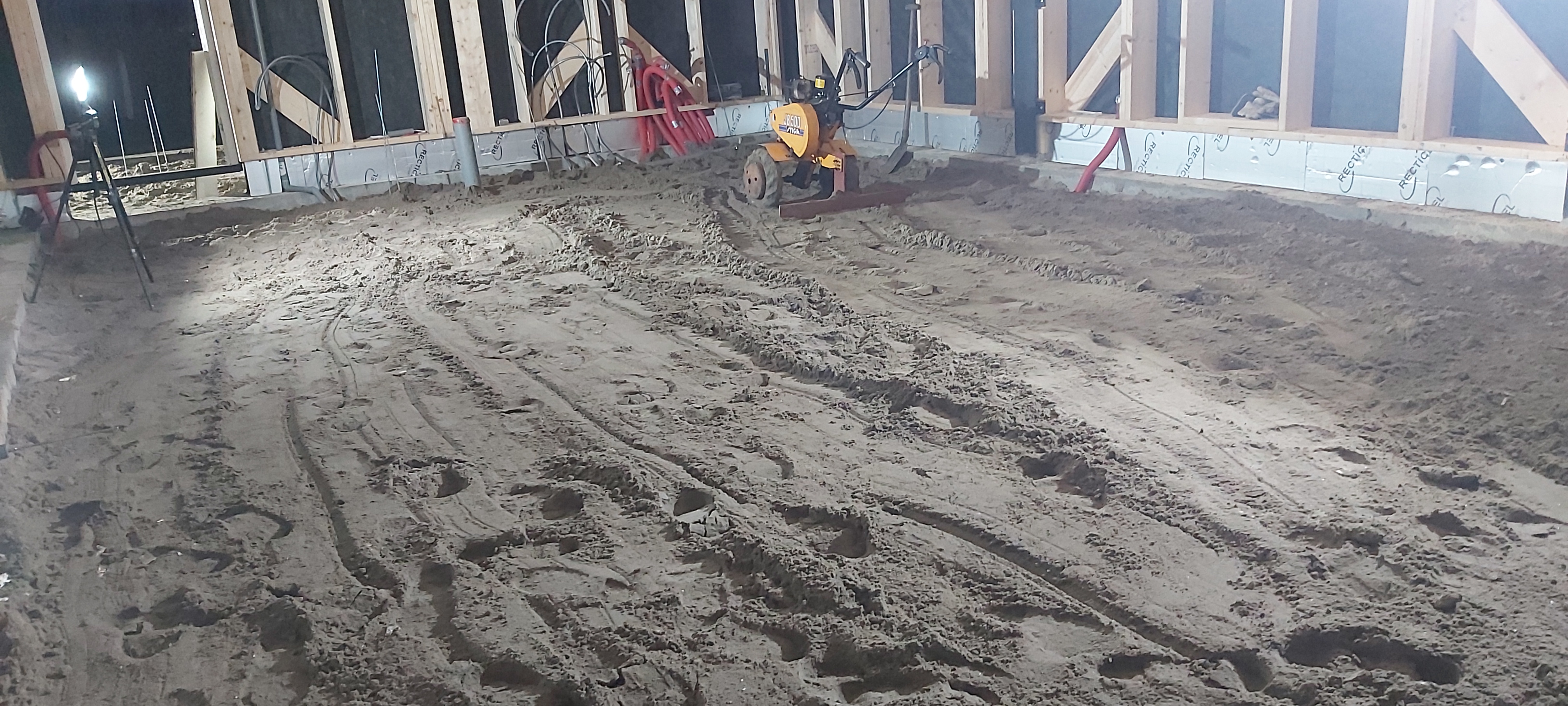 We inserted the case pipes, water pipes, and sewer in the sand bed. The building company laid insulation and reinforcement mesh to prepare the floor for concrete. I made two songs!