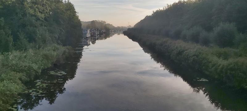 Although it's chilly, it's a lovely autumn day for biking; there's a faint mist hanging over the landscape. I took a picture of the houses along the canal. It would have made for a more beautiful picture if I had brought my DSLR camera, but I didn't have it with me today. That sounds like a plan. On a misty morning, I could go to work extra early, bring the DSLR camera with me, and make beautiful misty images. There is much beauty in nature in the morning that I would like to explore better in the future.