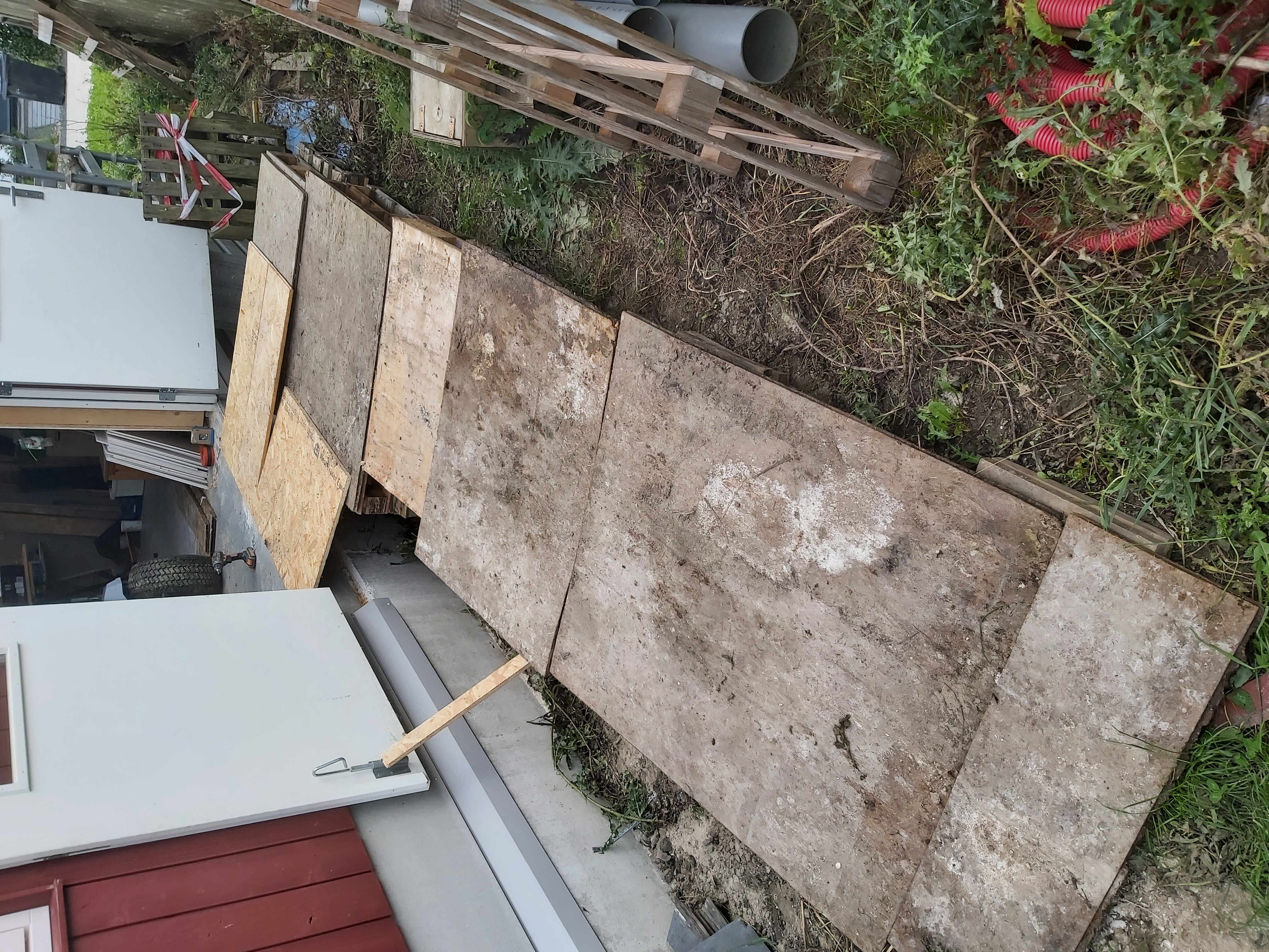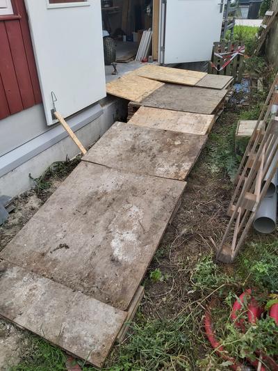 We had a heap of scaffold planks on the west side of the house. This heap is now in the way of the lawnmower. Another issue with the heap is the nettles growing around it. The third issue is that I have not laid the planks in a way that they stay dry, so they are rotting. I want the new location to solve most of these issues. It was here that I had my salad beds.