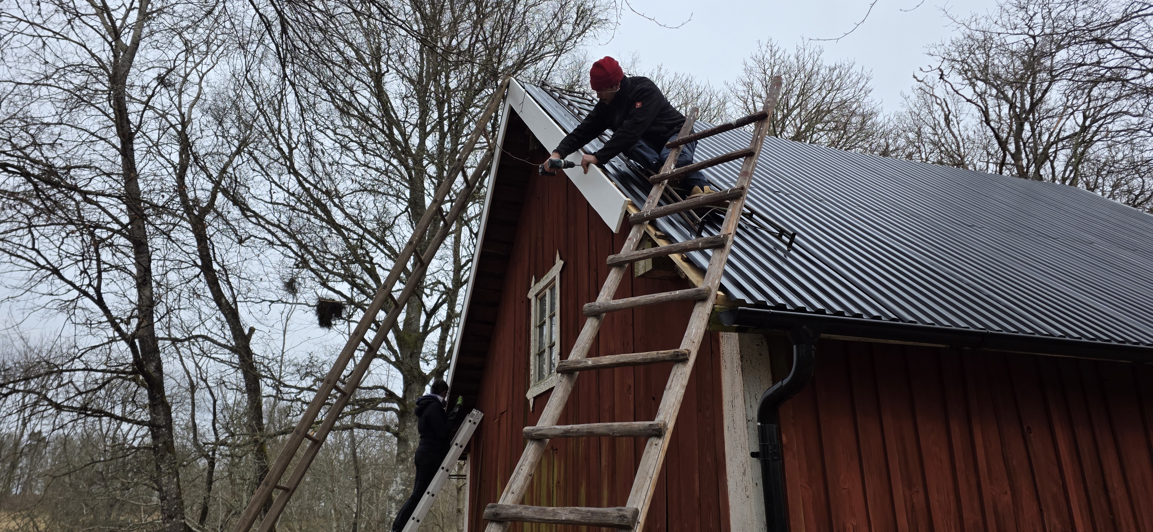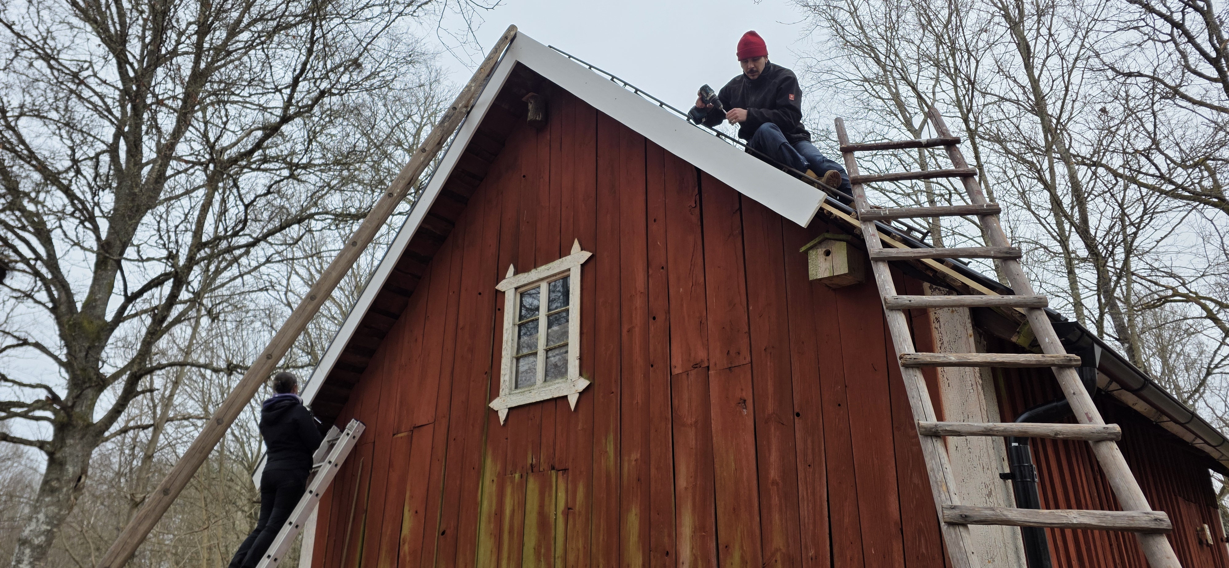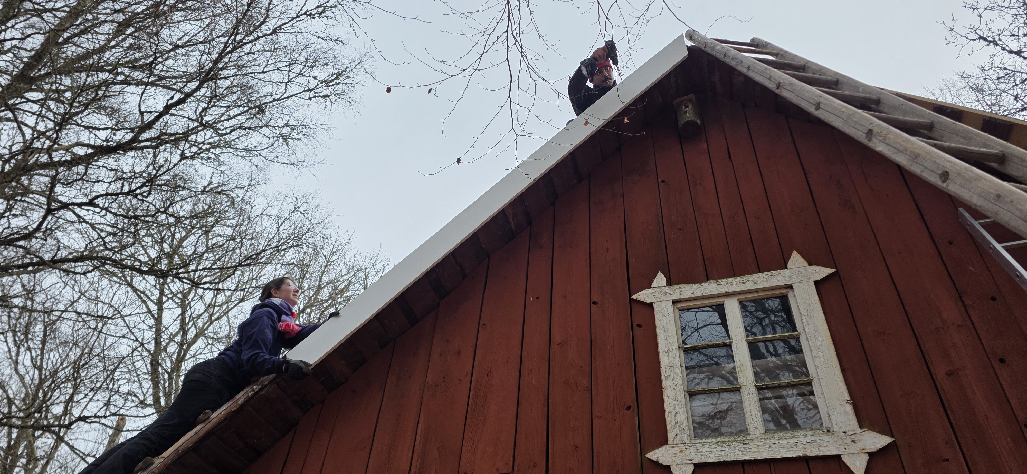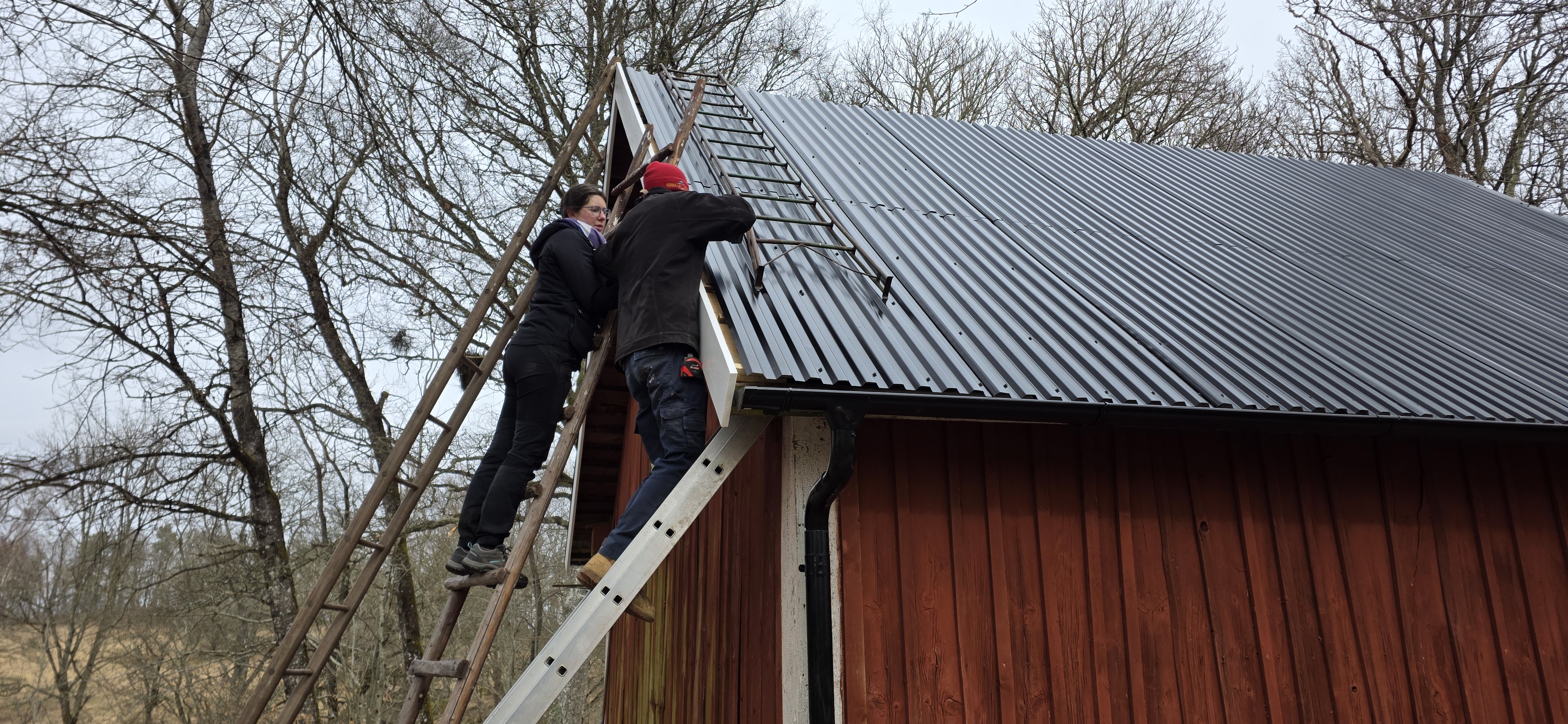 We mounted the left side of the fascia boards first. On top of the fascia boards, the metal top boards are mounted. Then the fascia boards of the right side, and on top of that, the boards. As the last step, the ridge was mounted.