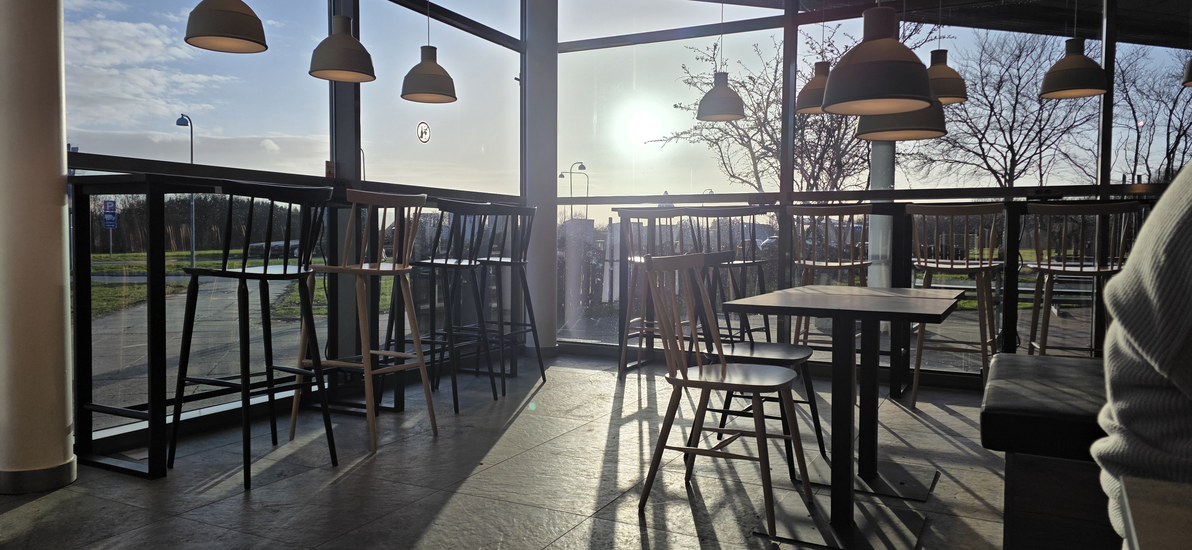 We switched drivers at a Danish road restaurant outside the town of Pedersborg. The sharp sun cast long shadows. The toilets had a handwritten sign in Danish saying they were not operational. All people who could not understand Danish just went to the toilets without hesitation. Others like me bounced off the sign. I had no idea where DW and DD went, and to my surprise, they emerged from the door to the defunct toilets. They had not understood the sign. It was not flowing perfectly during flushing, but otherwise operational.
