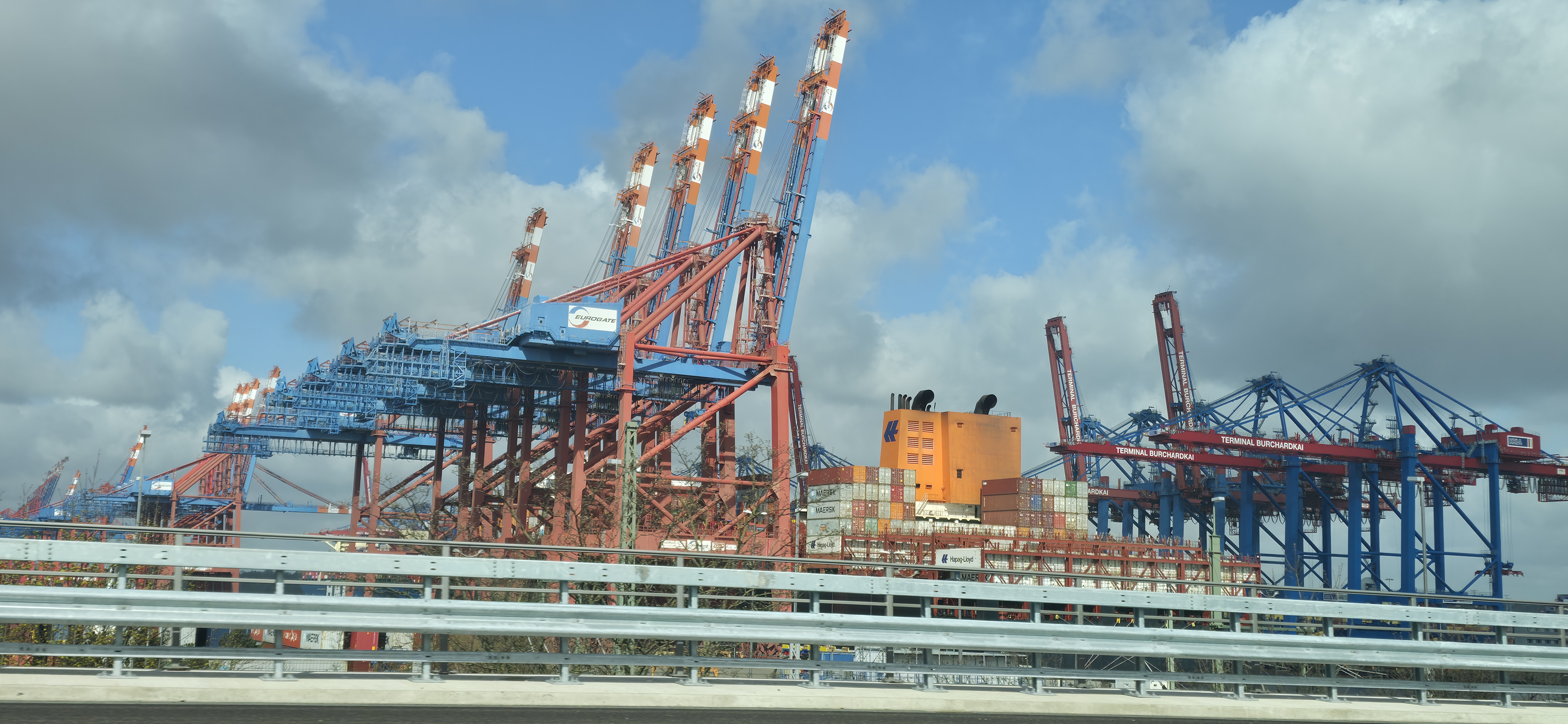 We passed Hamburg without any big traffic jams. The harbour was lit by the sun. The steel giraffes were standing in a row waiting for container ships to be loaded or unloaded.