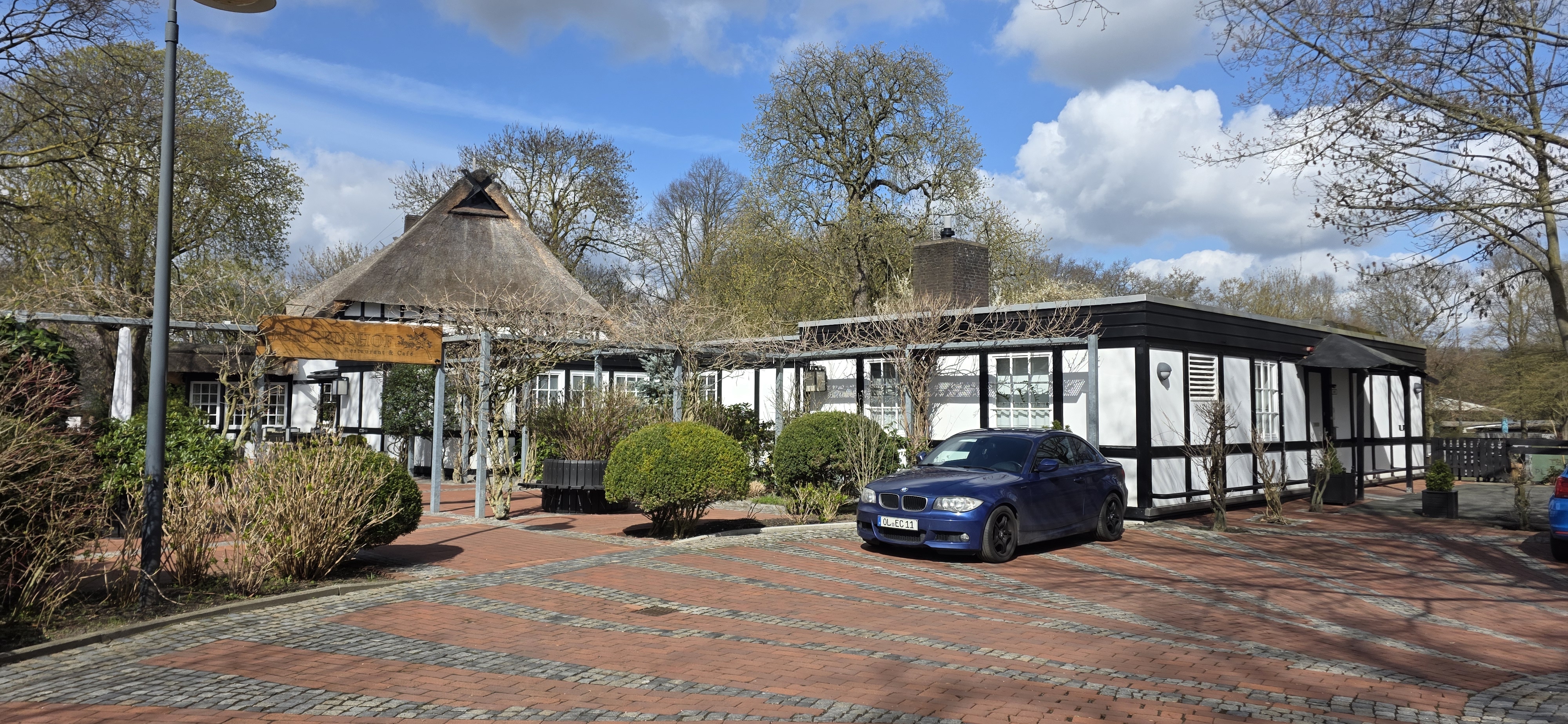 In Bremen, we drove into a considerable traffic jam. After a while in that jam, we started to get hungry. I found a restaurant away from the traffic jam. It was a restaurant located in a park, and it looked nice! It was almost as nice that DW and DD thought we had to wear more festive clothing to be allowed in. That was not the case, though; we got a table.