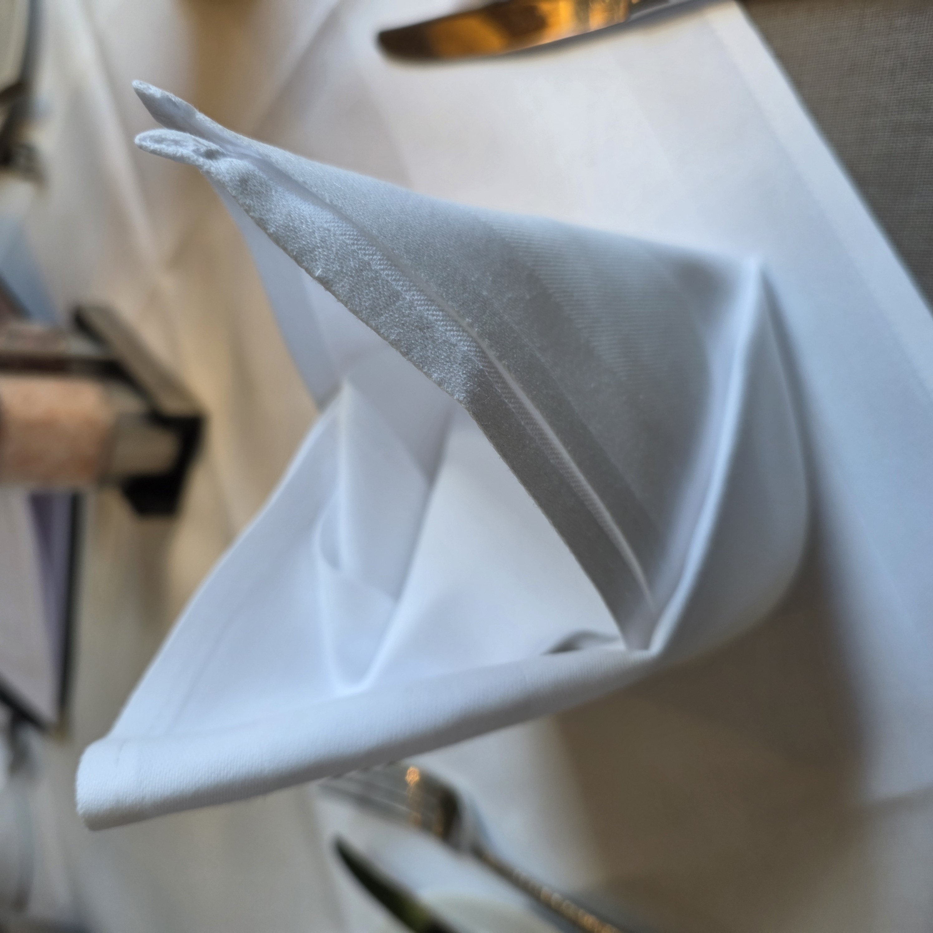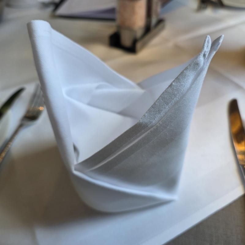 It was delicious. All was stylish in this restaurant—the beams in the ceiling, the iron plates on the wall. The napkin was folded into a crown.