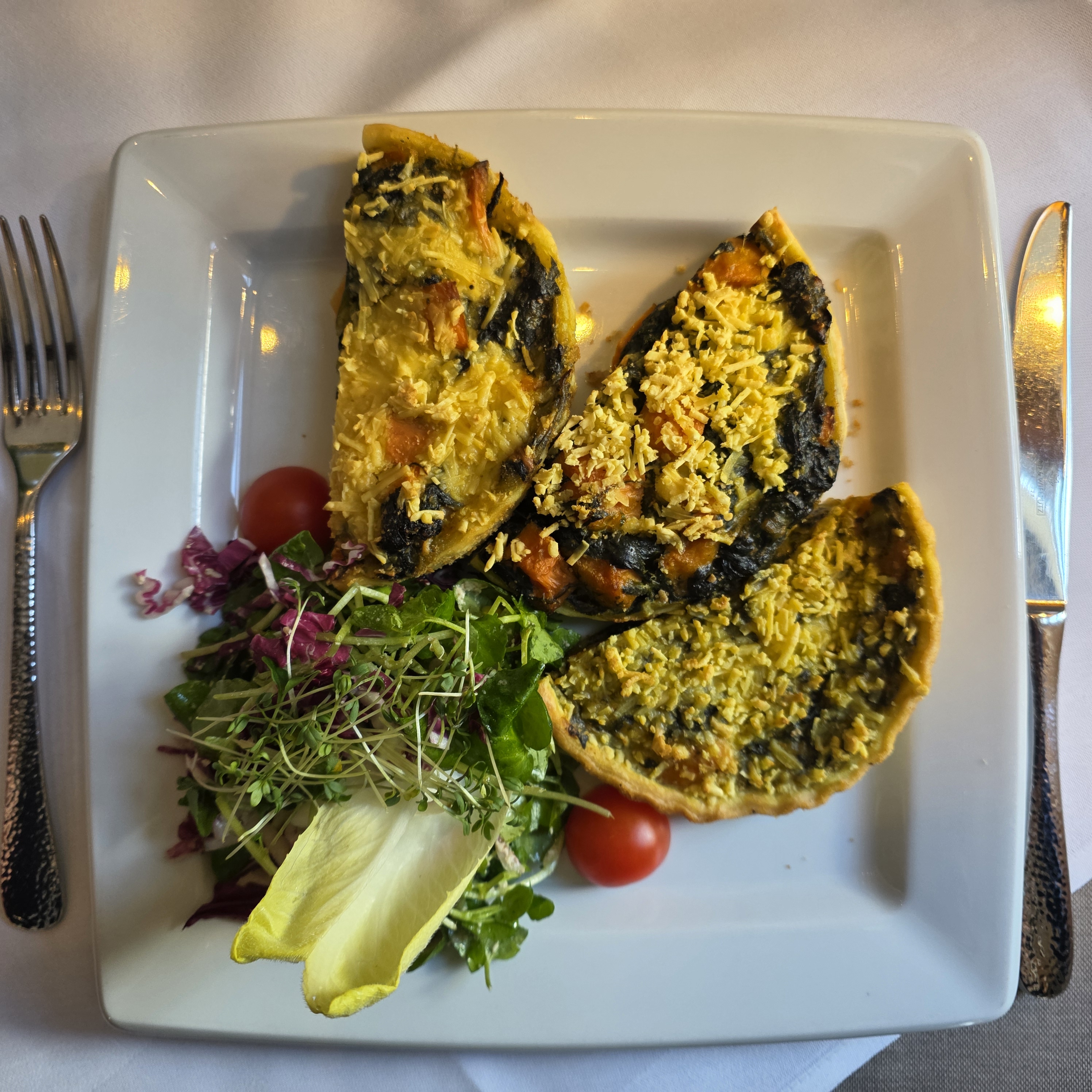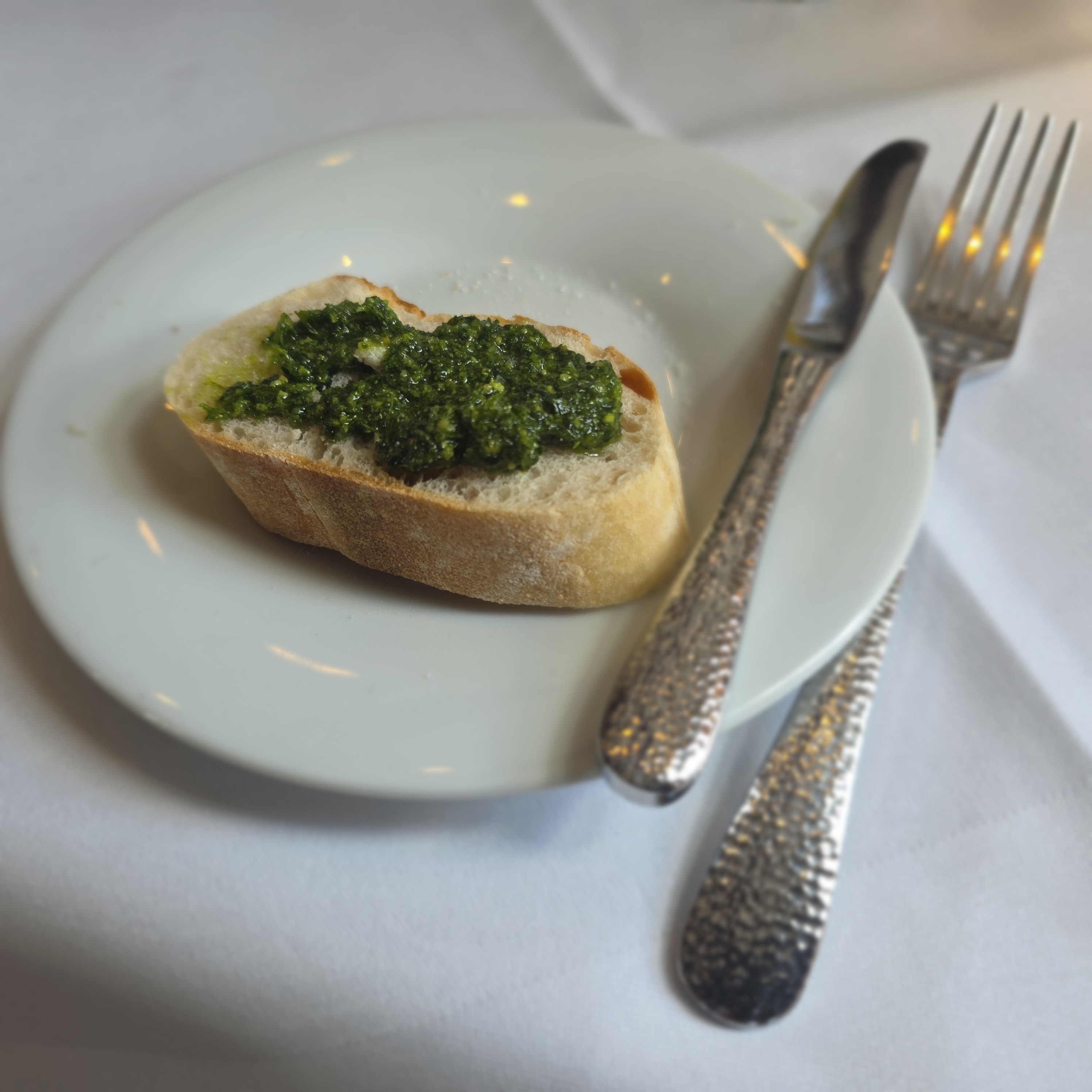 We got the menu card, and I immediately knew that I wanted the spinach quiche. We got bread with pesto made by the restaurant. It made me think of the pesto that DW sometimes makes from ground ivy. To this we had bread.