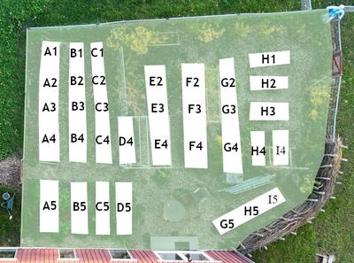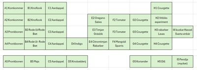 We divided the garden into a grid, in a well-known pattern of letters for the columns and numbers for the rows. DW made an Excel sheet with our plan.