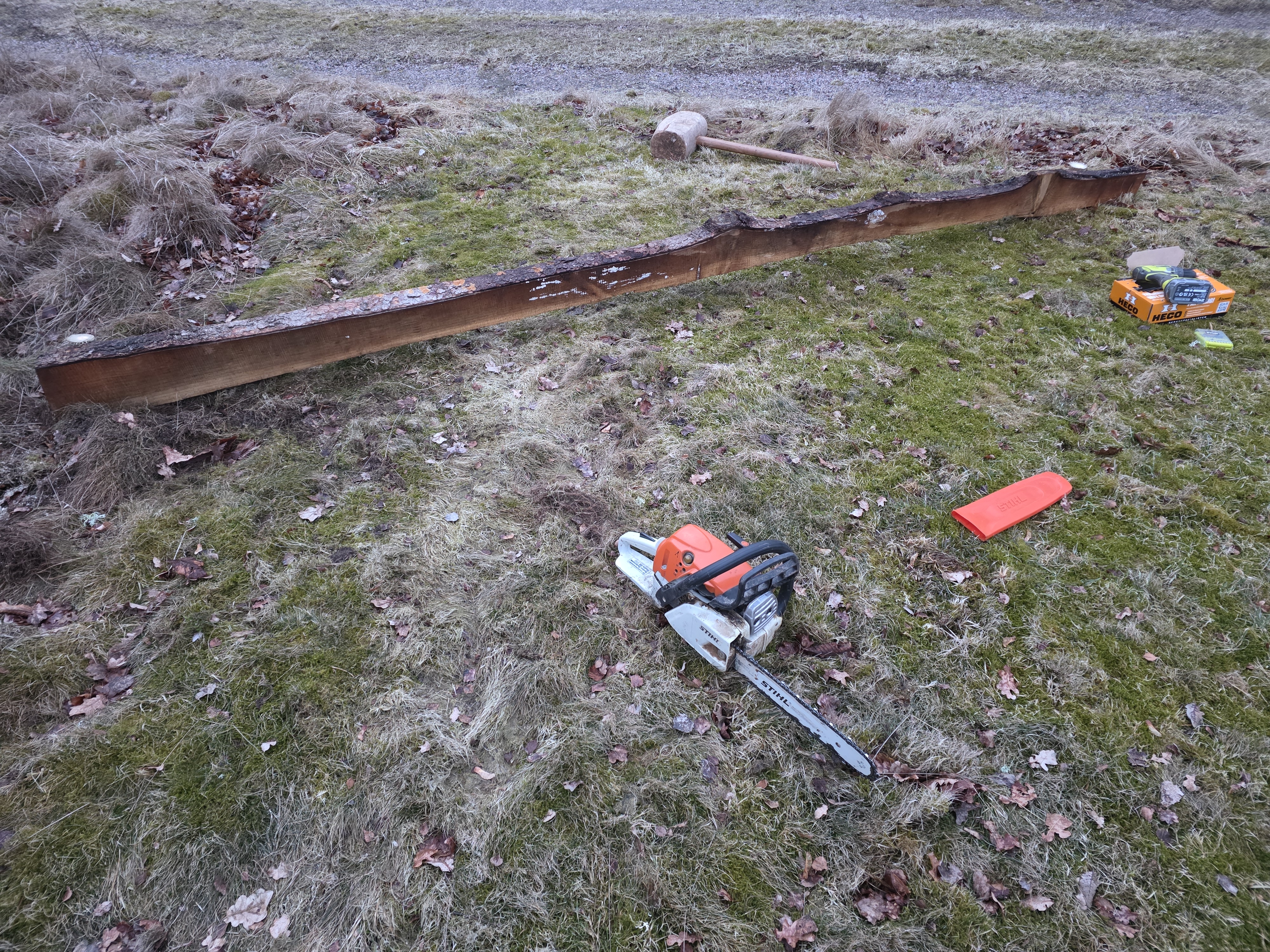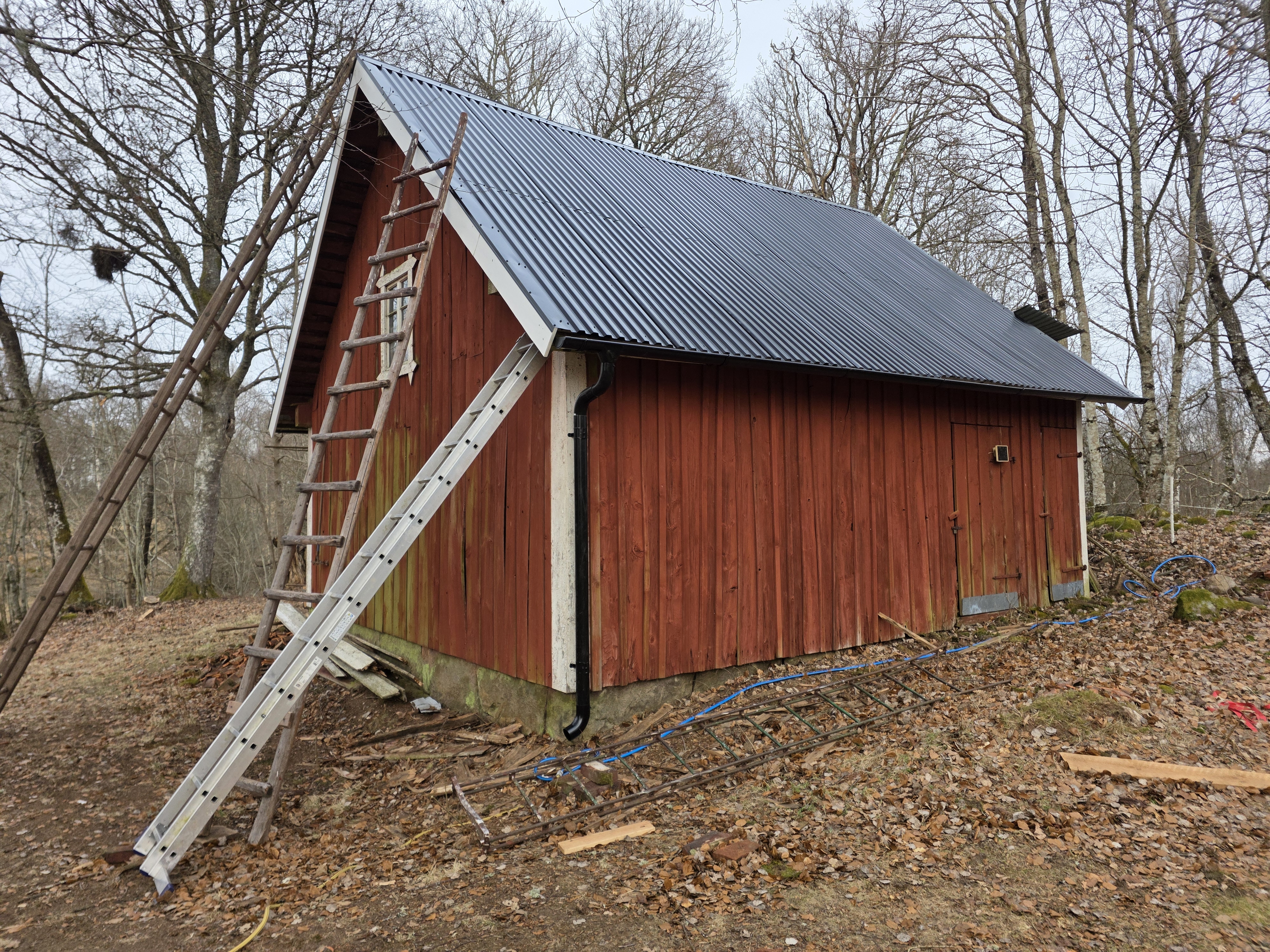 I cleaned up the workshop house and arranged for a fence for the robot lawnmower. It is just a leftover plank from when we cut planks last summer. It will keep the lawnmower from getting disoriented and landing outside the cutting area. At least, that is what I am hoping.