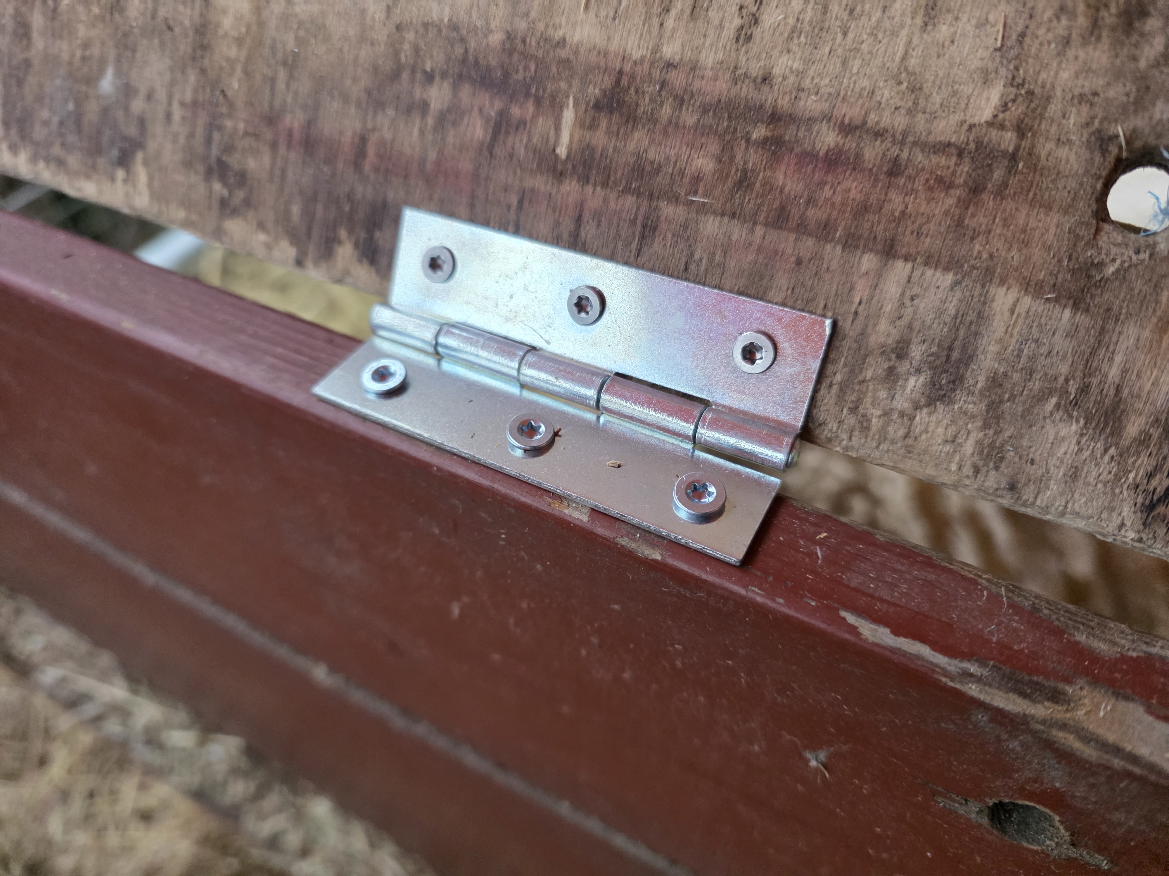 The rope that acted as a hinge was worn out, so I replaced it with real hinges and added a handle to the lid. It is a little challenging to work on a hayrack while three curious sheep are using it. Oh well, I managed.