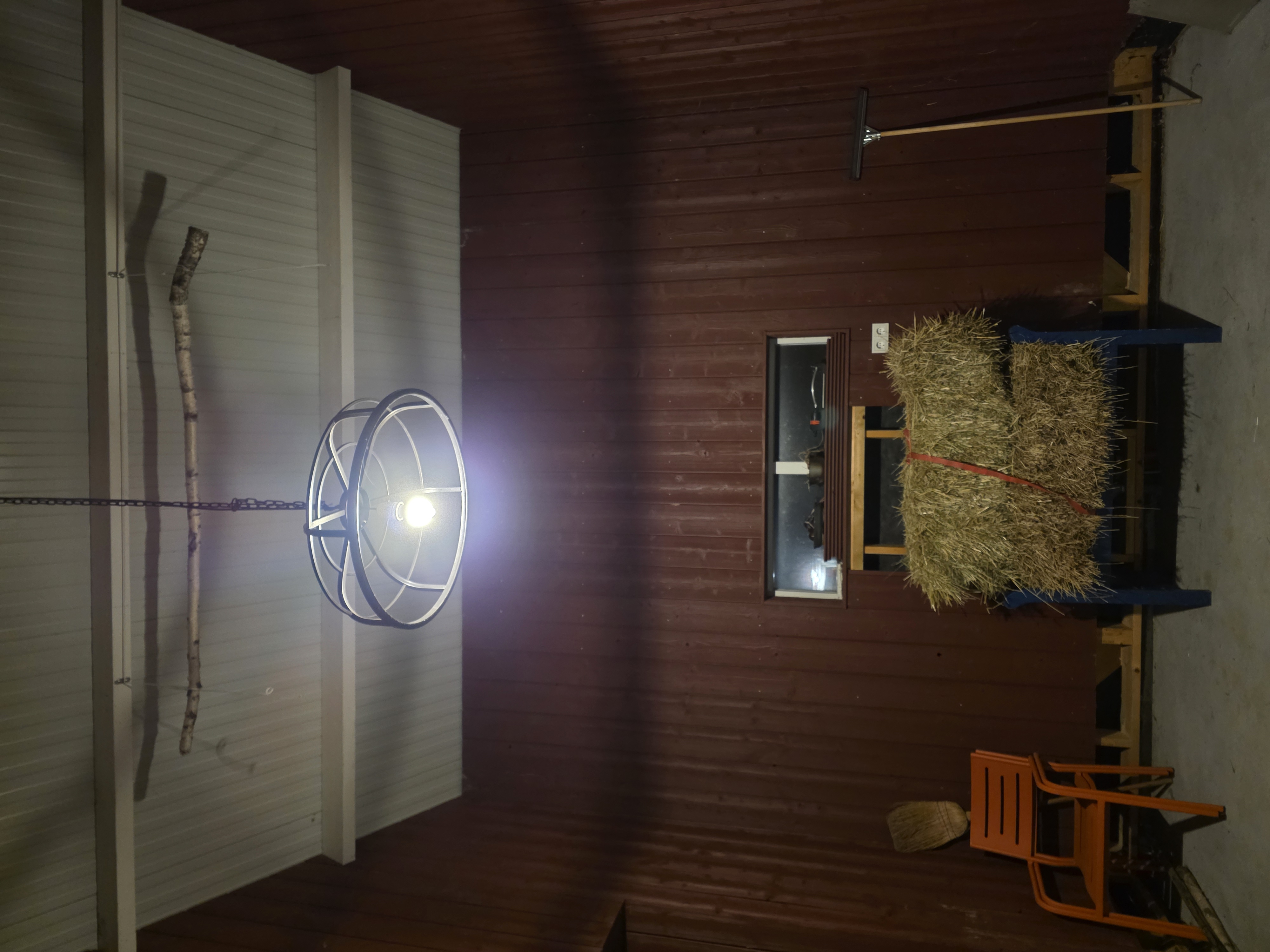 Now it was dark. Here is how the lamp fixture looks. You can also see the birch tree trunk hanging. We took away the onions because we don't want the onions to freeze. It is nice and tidy. The two hay bales that didn't fit in the temporary hay shed are living on the blue bench.