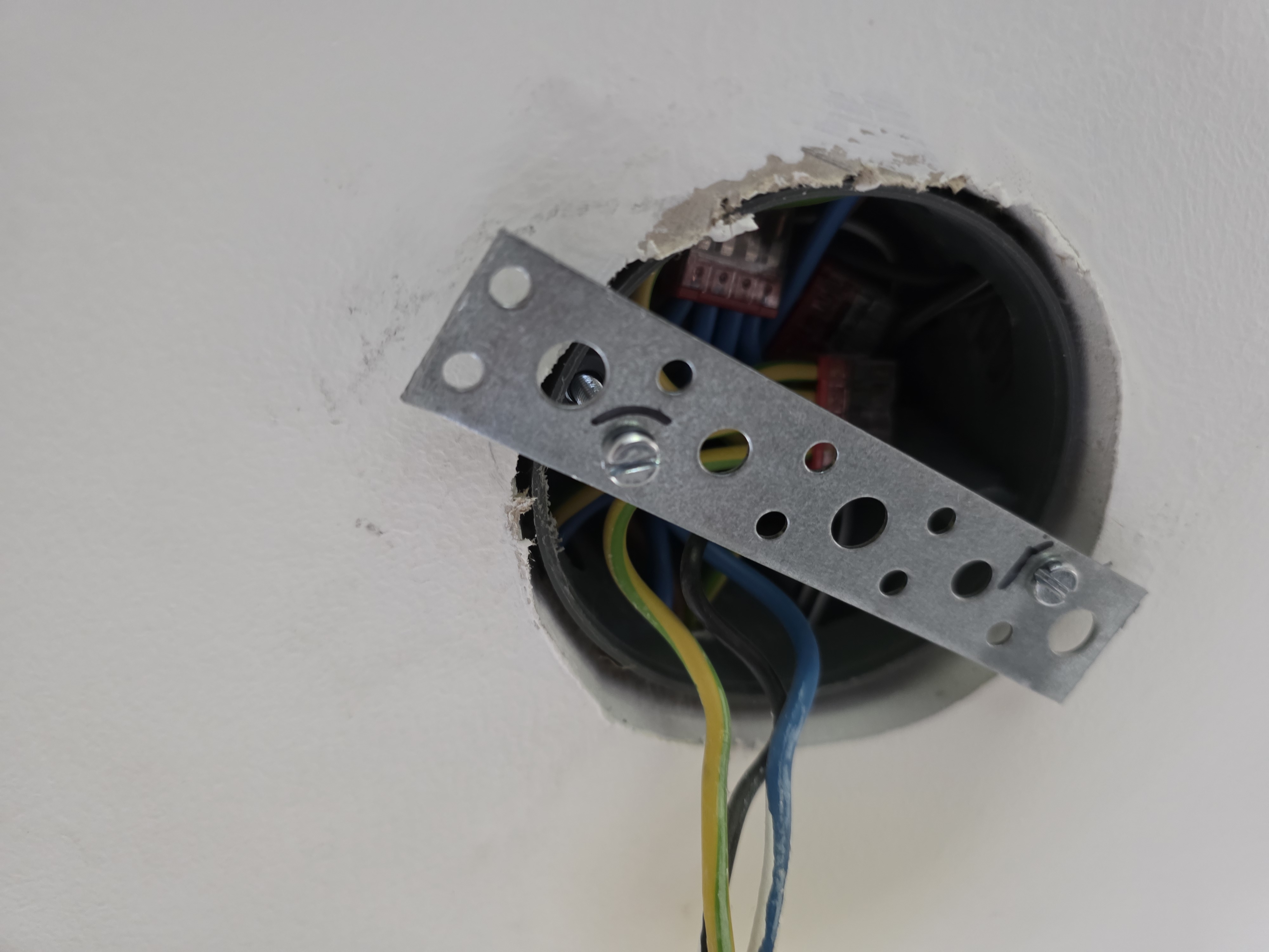 In the first part of the day, I wanted to work on the lamps from Zangra that arrived on Thursday. Our ceiling boxes lacked the screws at the proper spacing, so I had to figure out how to do it. This isn't very pleasant because we got standard-size boxes, and it would be much less effort if the lamps came with two screw holes spaced the same distance apart.