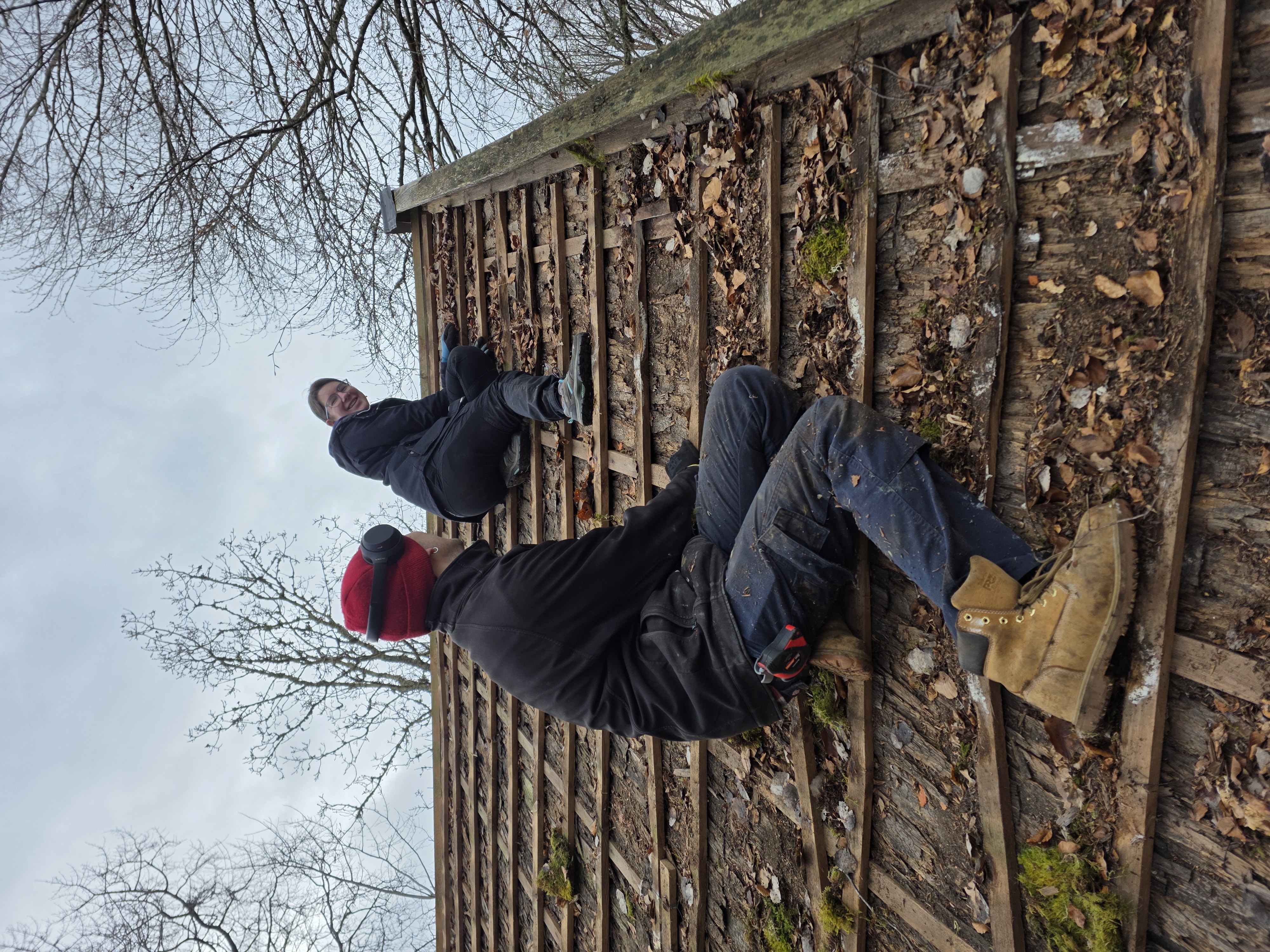 At this point, we were really tired. WB rested, and DD and I broke down the scaffold. We mounted the scaffold's ground frame on the south side of the building. Shoulders and knees were complaining. For the rest, the mood in all of us was great. Things are going well.