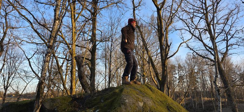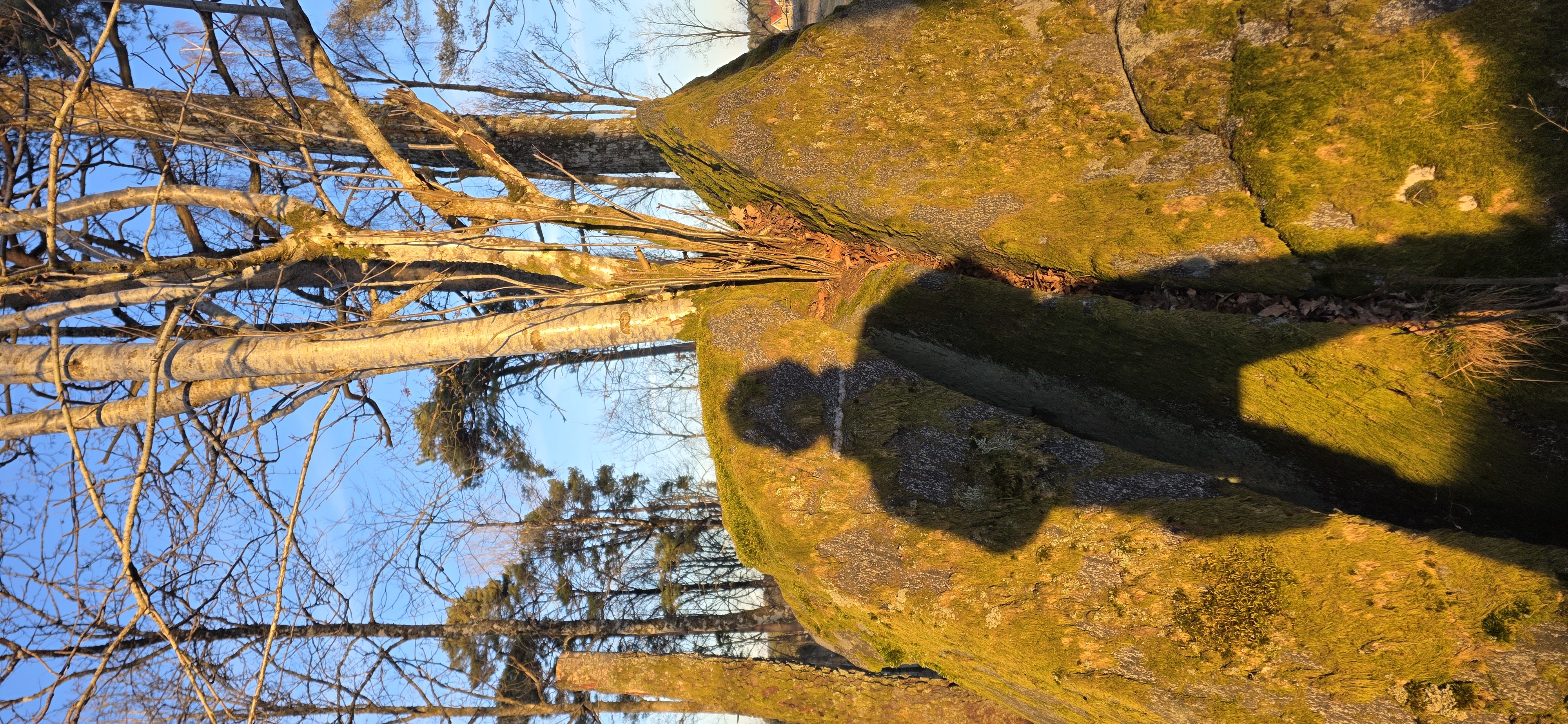 After today's work, we had a walk around our property. The sun was setting, and the light was golden. I found a rock with a split in it, and in that split a tree grew. I could not take a photo of the rock and the tree without my shadow being in it. Instead of trying to sneak the camera in, I made a feature of my shadow.