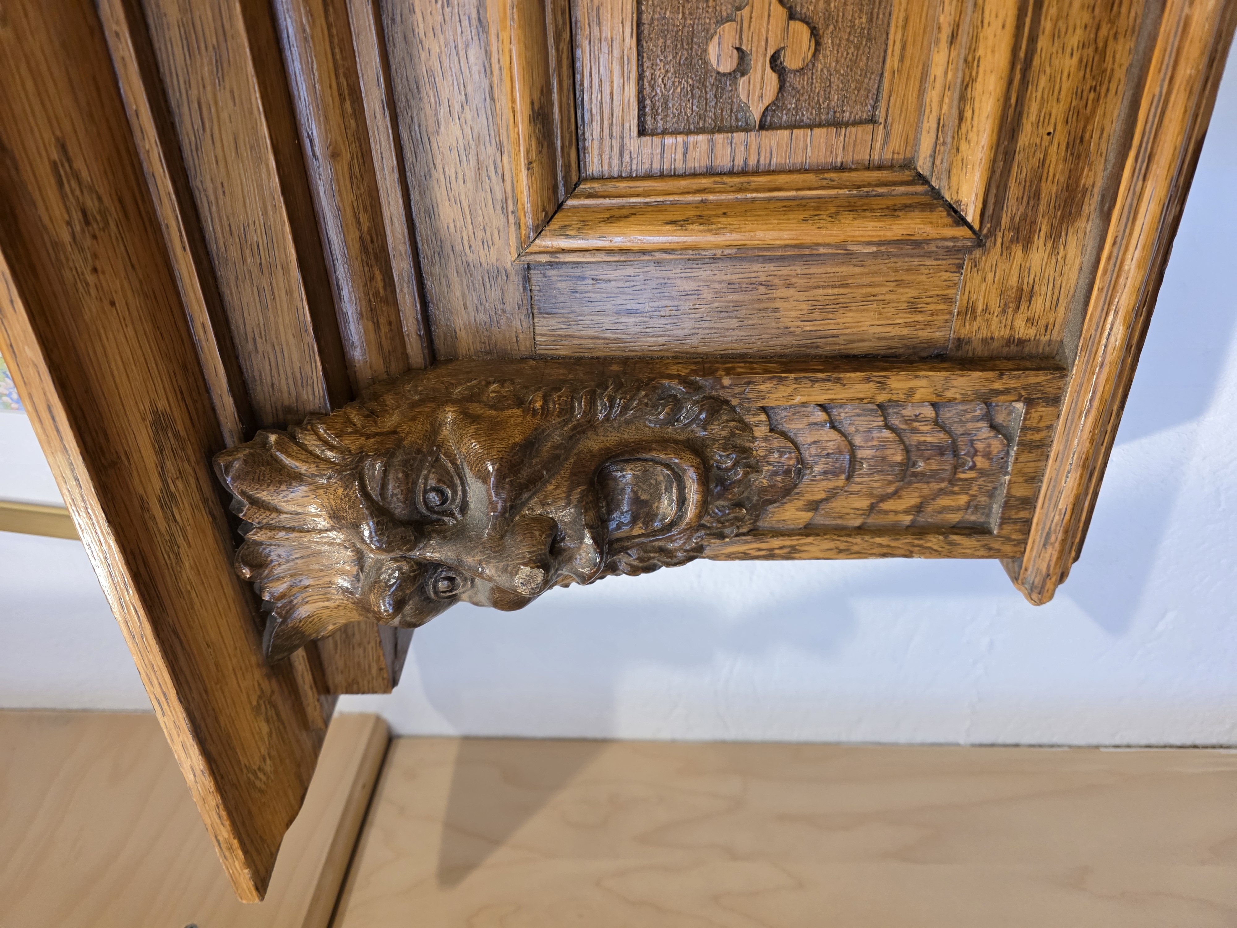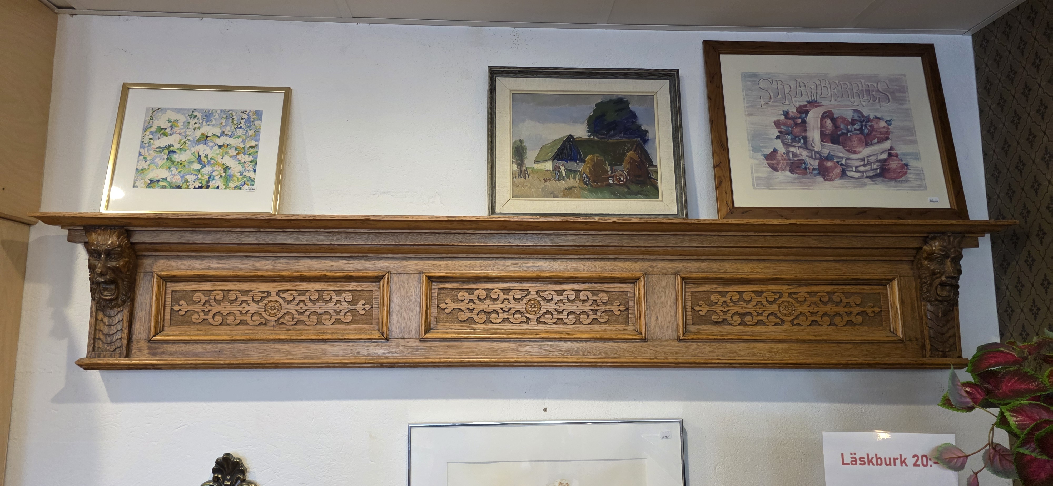 At the cafe we had coffee and cake. They had delicious cakes in this cafe. I found a shelf in the cafe that was not on sale, but it was marvellous. It had two carved faces. Perhaps the faces were screaming? It was made of oak. I do not think we would buy it, but it was cool enough to be remembered with a photograph.