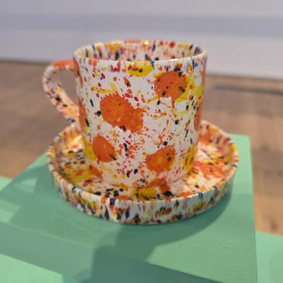 At Vandalorum, we visited an exhibition by the Japanese artist Masayoshi Oya. He currently lives in Sweden and has a studio in Gothenburg. It was a nice exhibition, though a little meager. Of all objects, this mug was the most spectacular in my humble opinion. It is a perfectly straight mug, which is not that inspirational on its own. The saucer is also completely flat; it does not even have a matching ridge for the cup, indicating the spot where the mug is supposed to be standing. This is minimalism leaning into munk mode. Since Masayoshi is Japanese, he perhaps adheres to the Minimarisuto minimalistic lifestyle? Of course, not forcing the cup to stand in the middle of the saucer makes the usage more flexible. This way, the cup can stand perfectly well on one side, and there is sufficient room for a delicious cake on the saucer next to the cup. Still, perhaps the minimalist people would frown on that excessive indulgence of a minimalistic saucer?