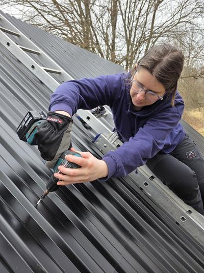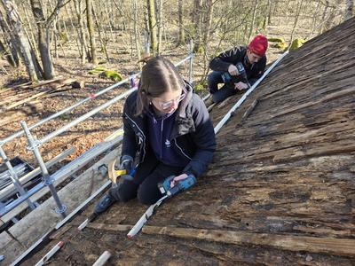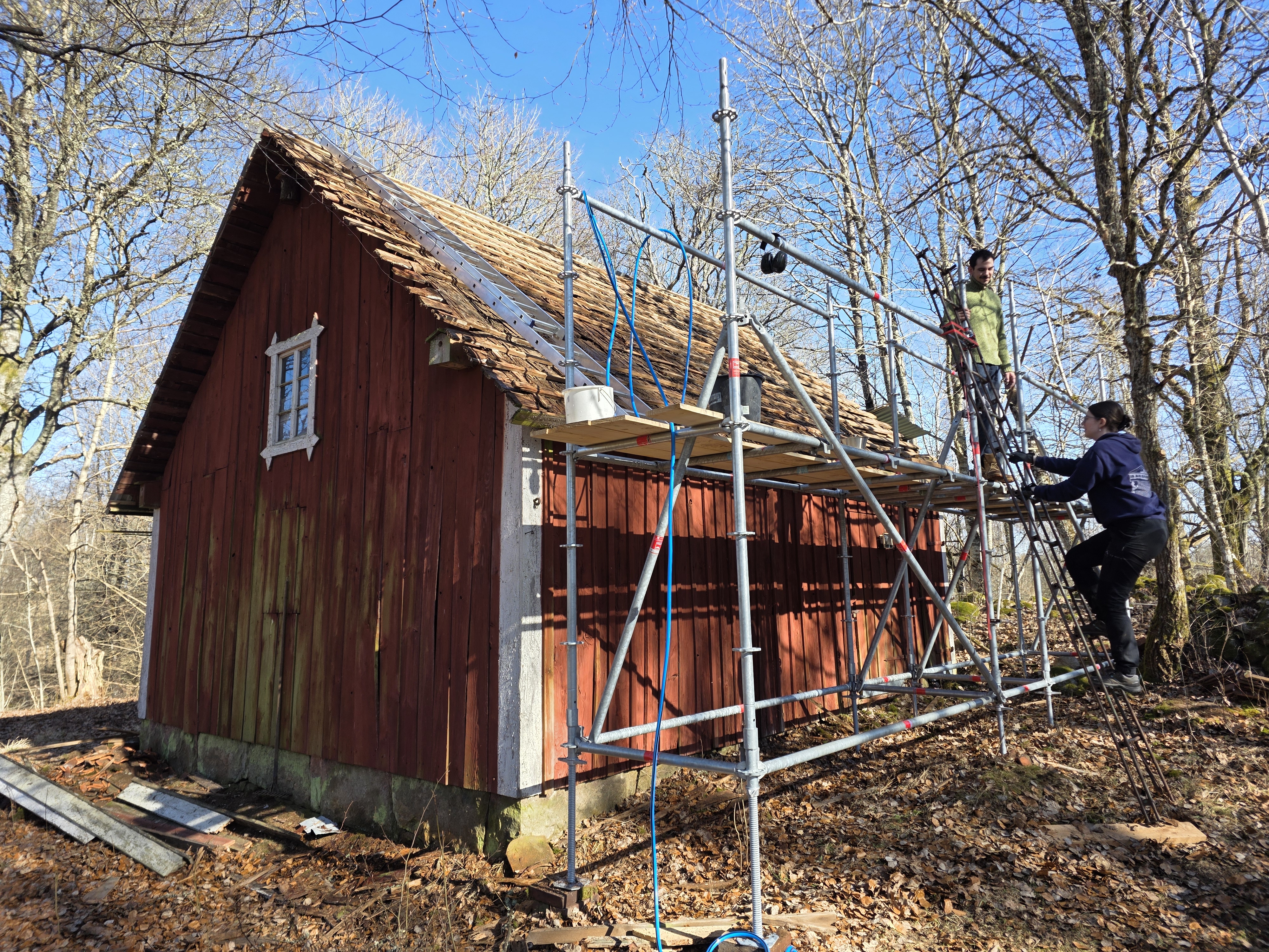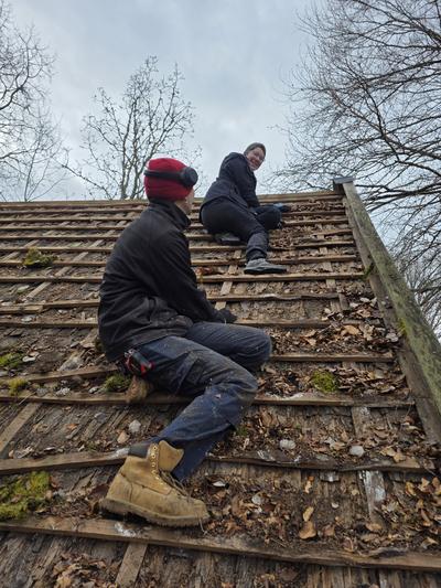 We had the ladder lying on the newly mounted boards on the roof. That way, two people could work on the next row of boards from each side. One sitting on the beams and the other on the ladder. The ladder could rest on the scaffold's platform. Here we screwed a beam onto the platform so that it would not slide away. Overall, the scaffold proved crucial to the work on the roof.