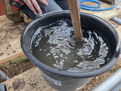 When we returned to the cottage, we mixed the oxalic acid in a bucket and applied the liquid to the north roof. We mixed the acid so that it was 10 percent of the water. The mixture was poured from the ridge, and we brushed the roof as it flowed down. The roof has to dry before we can continue to set up the beams that will support the metal roof plates. That is tomorrow.