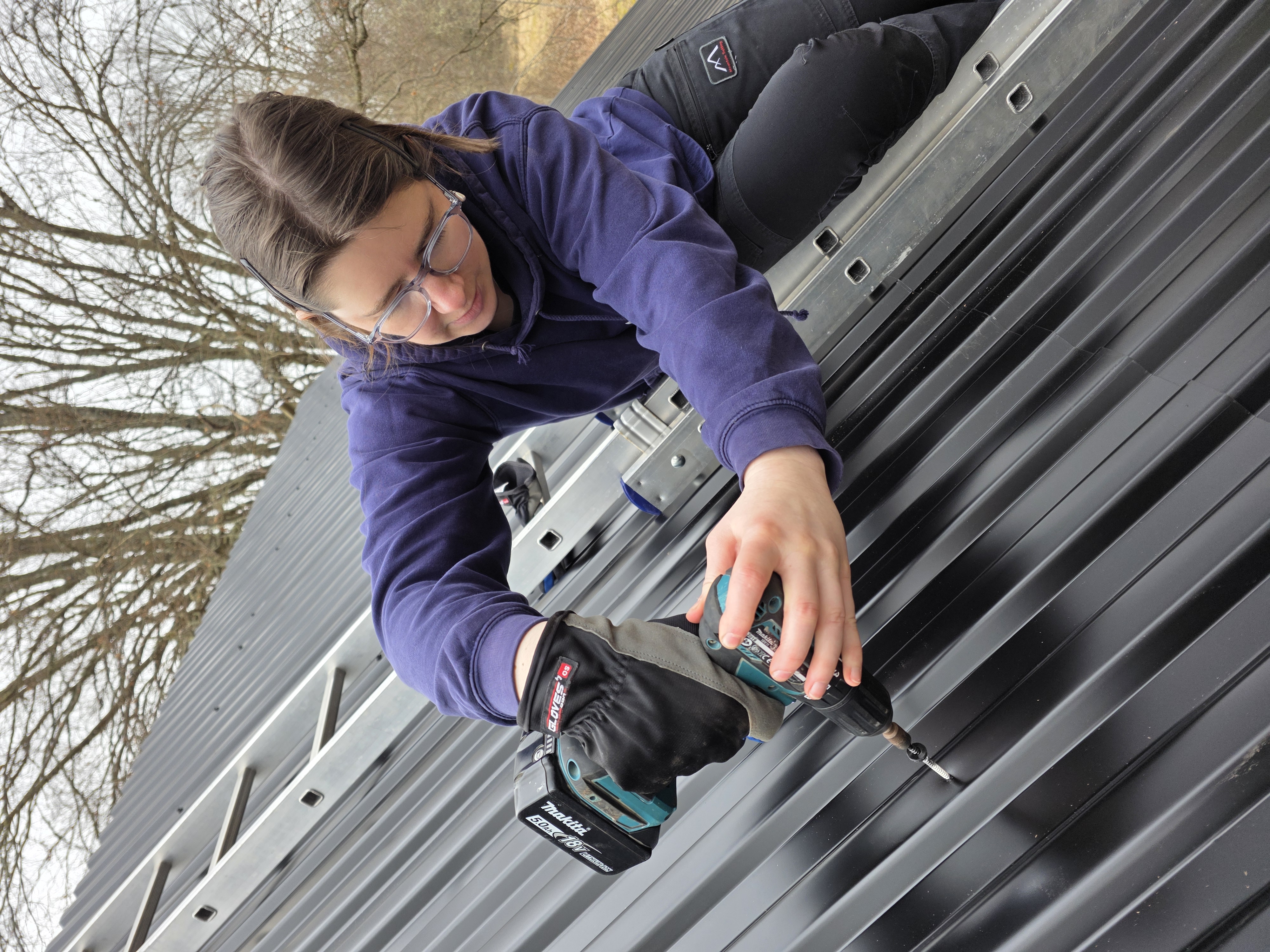 Then we could continue mounting the roof boards. The screw's ability to drill through the board was questionable. One had to apply force to activate the drill capacity of the screw, and that was challenging. When I sat in a good position near the screw, I could use my muscle strength, and that worked fine. DD also has plenty of muscles, but she preferred to hammer a dent into the board before drilling. When stretching into the board from the side, I couldn't even apply enough force.