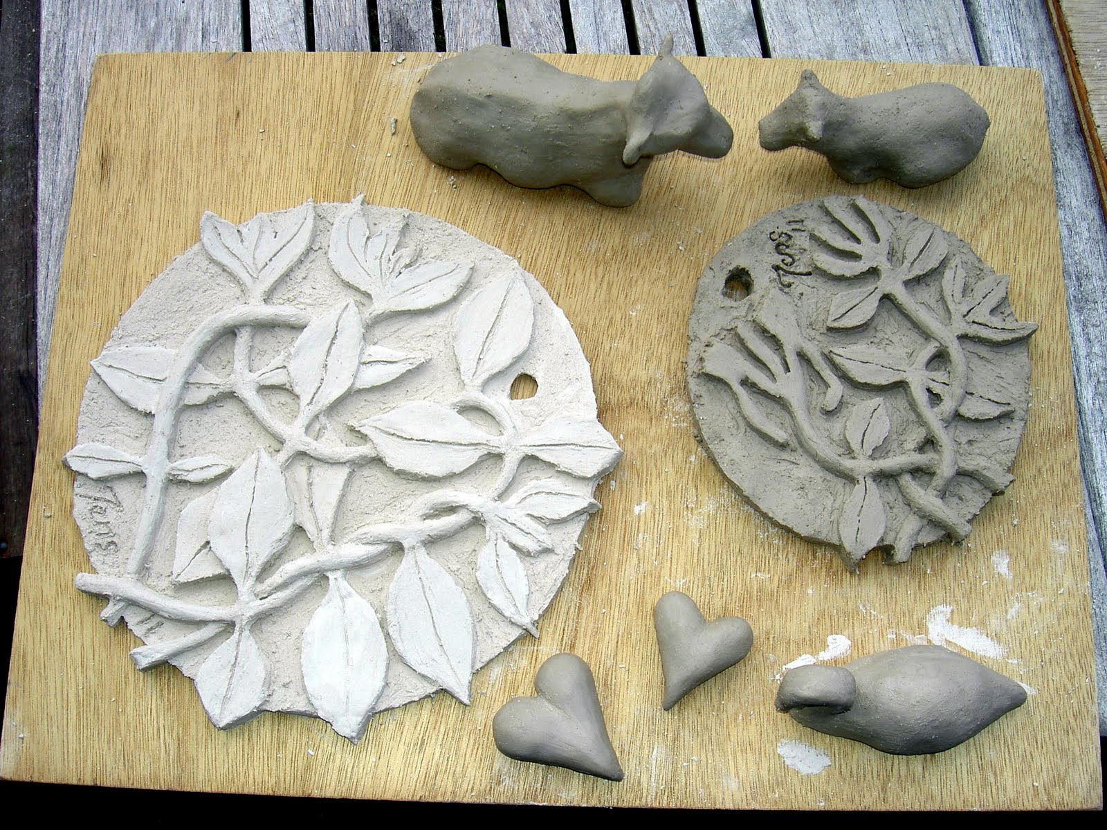 The preparations for the ceramic bisque stove is in full swing. Today I made another honeysuckle relief and this time I made it considerably thicker, that is the Grey plate on the photo. I used the balls technique again to avoid cracks. Also this time I made the plate smaller and more on free hand so to speak. I went over to a honeysuckle plant to see how it is made and collected a bit more inspiration for the flower.