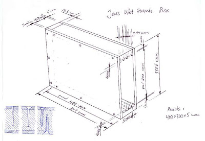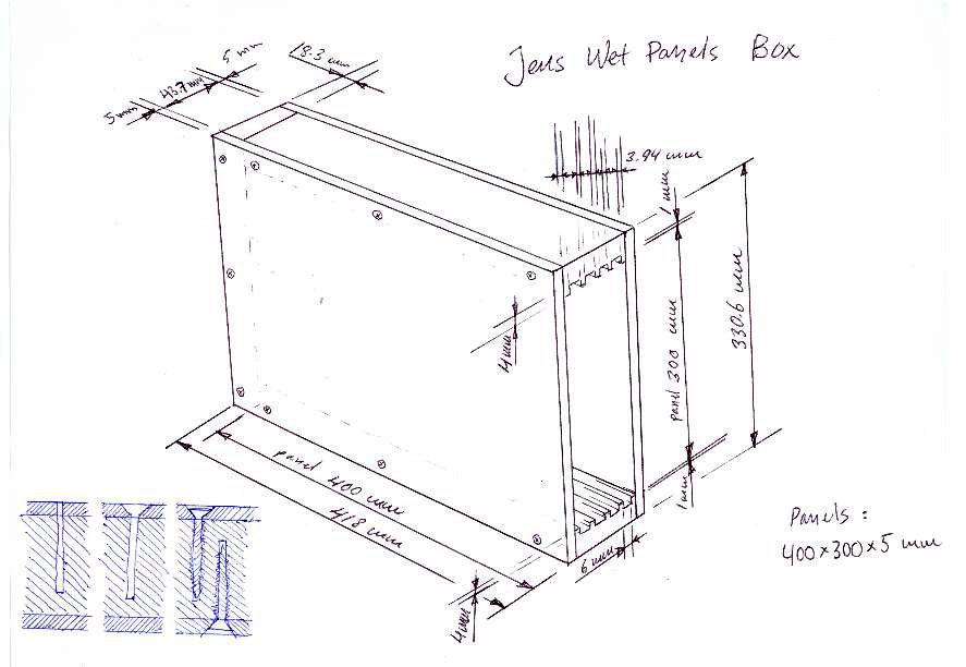 Here is schematic drawing of my box. It is very simple and it can be done in a various ways but this is how I decided to make it. I create the box for four panels. I make grooves in two wooden studs and put two side plates around these and one stud in the bottom. Based on the sizes of the studs used I came up with the measurements for this construction. I leave a gap of one millimeter on each side of the panel so that the panels will not get stuck in the box.